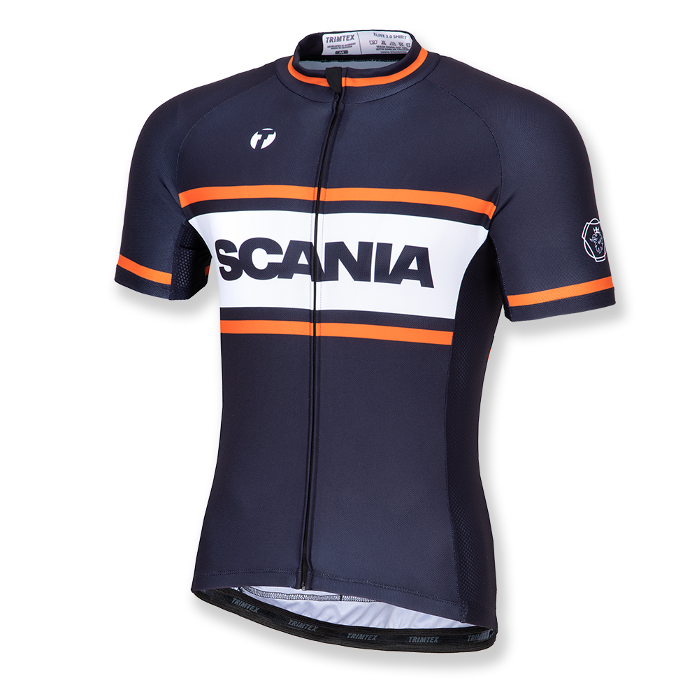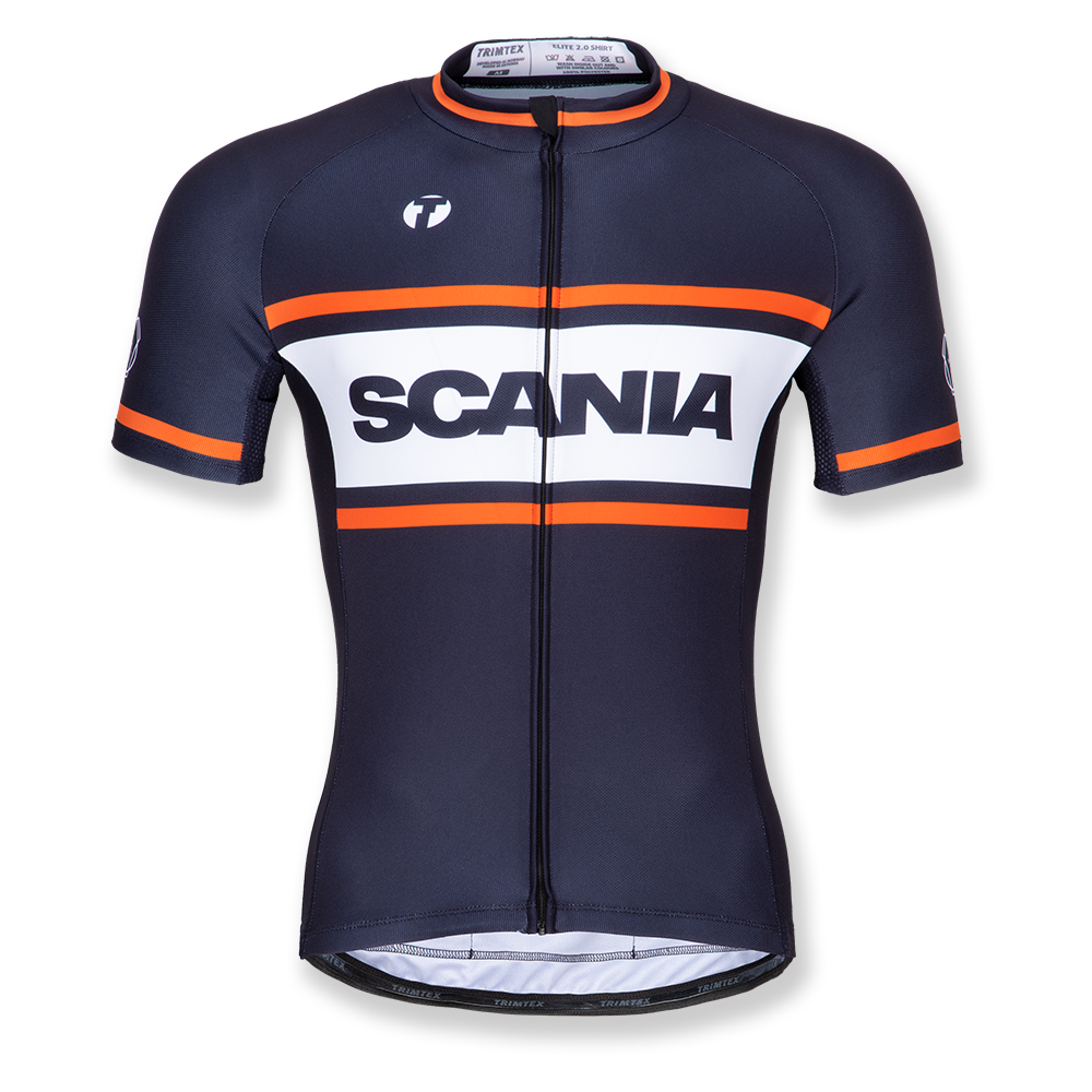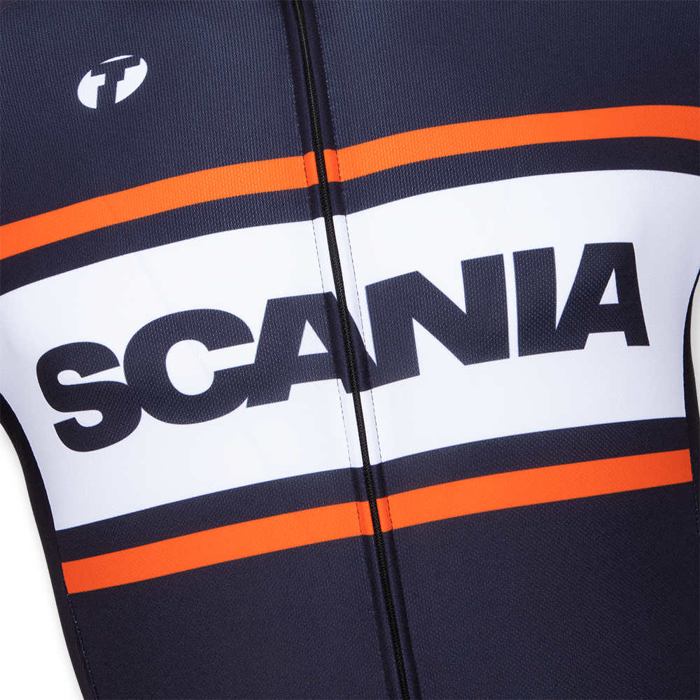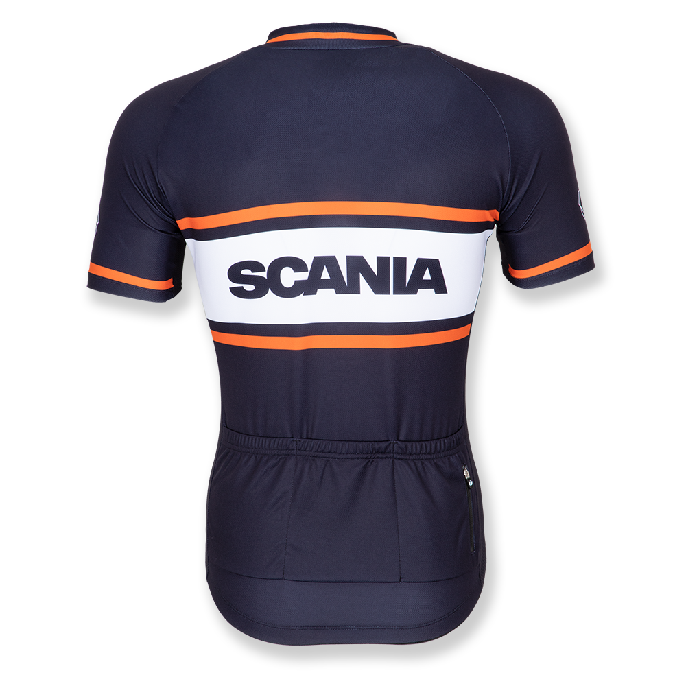Details: Snug-fitting jersey shirt, that sits close to the skin for reduced air resistance. Scania symbol on sleeve, Scania wordmark on the chest. Robust zippers and three pockets on the back. Elastic dropped hem to the back.