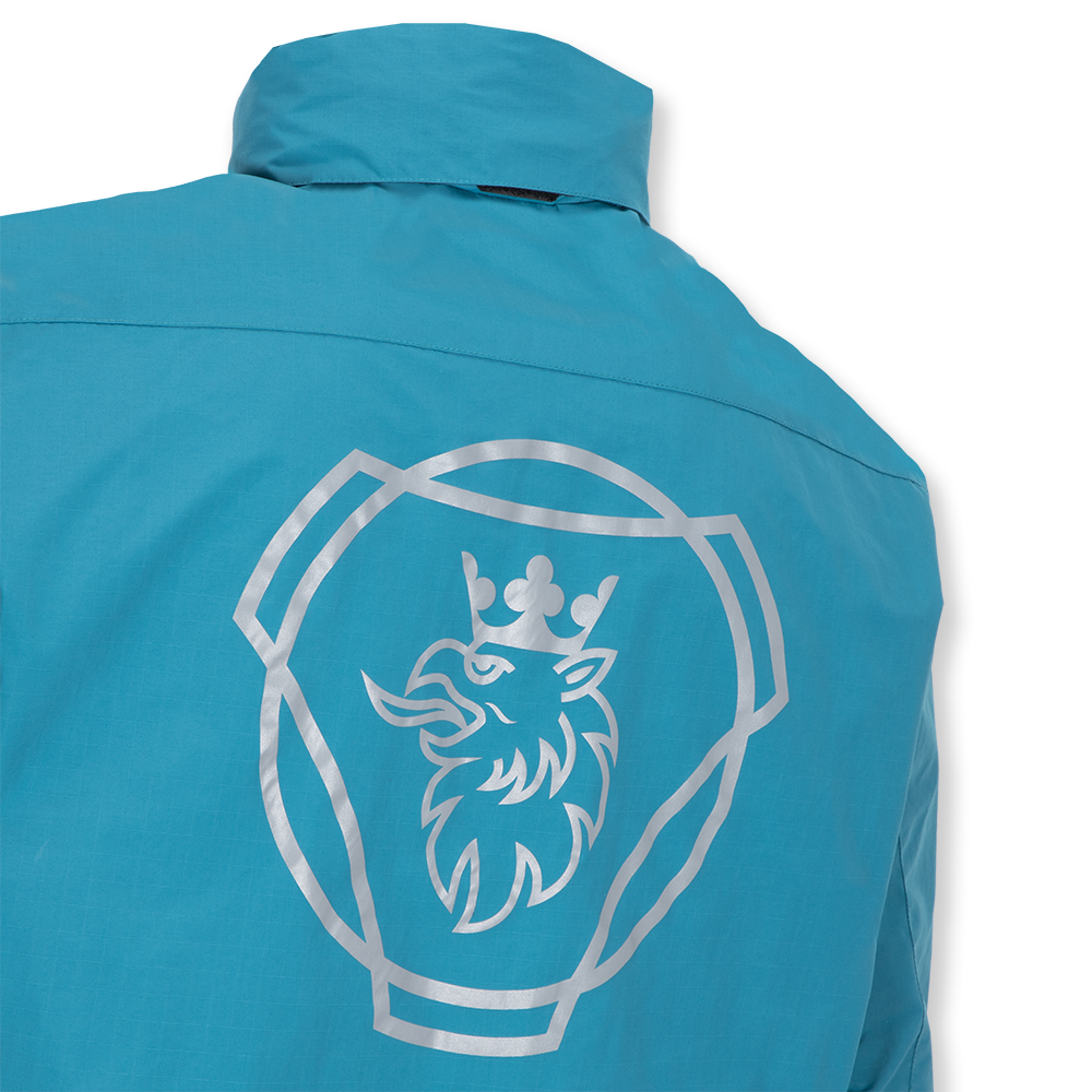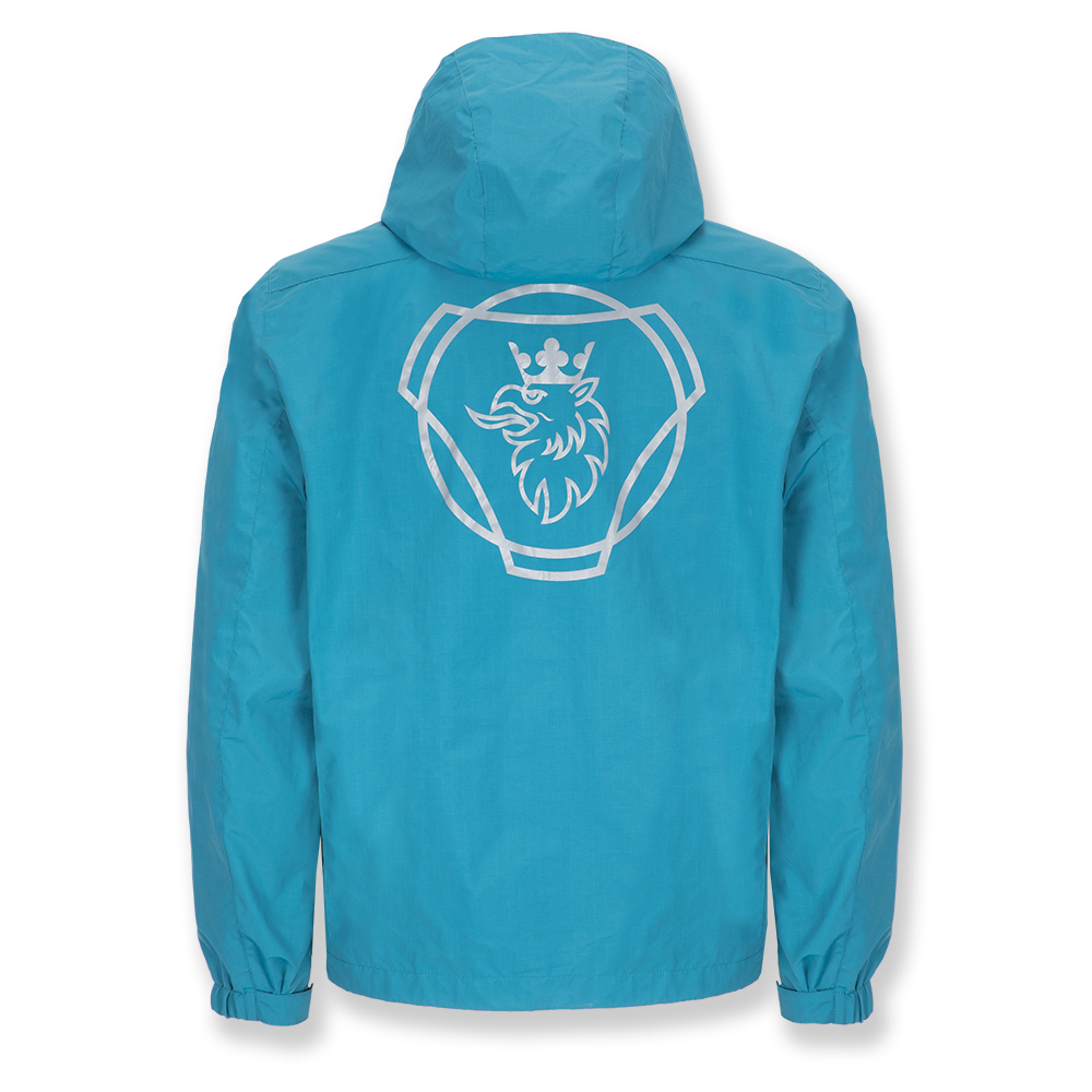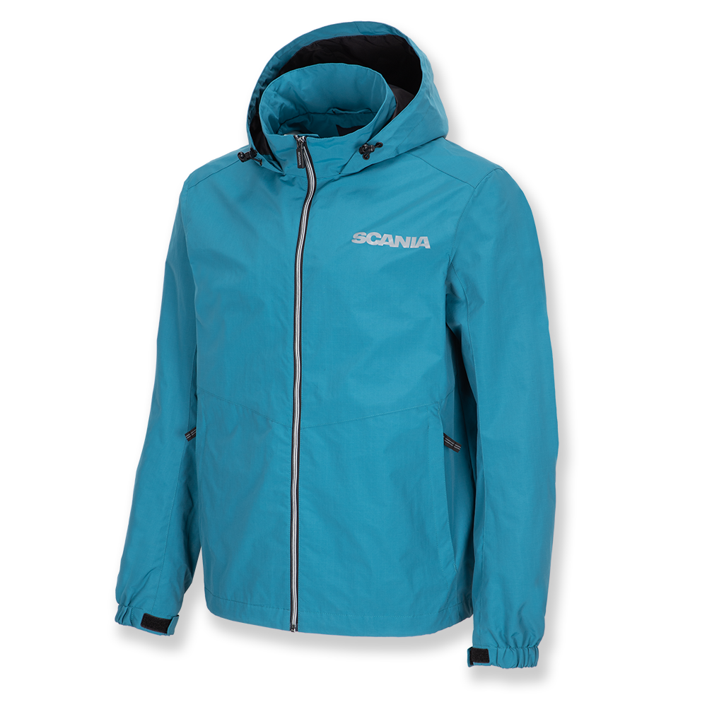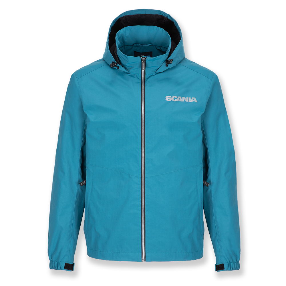 Details: Scania wordmark reflective print on chest and Scania wordmark print at back. Colour contrasting mesh lining and front packets with hidden zippers. Hidden hood in collar, velcro closure. One hand pull drawstring solution at bottom body. Sleeve ends with elastic and adjustable velcro straps.