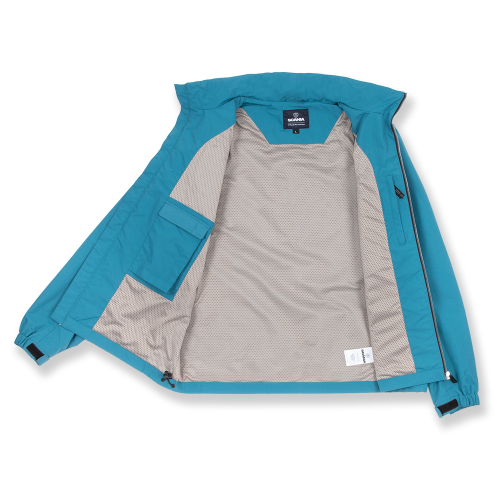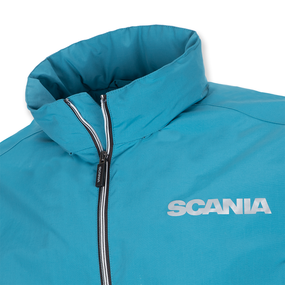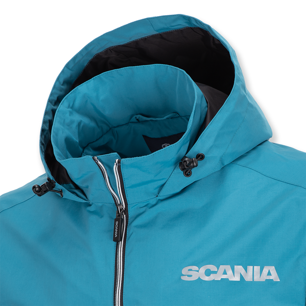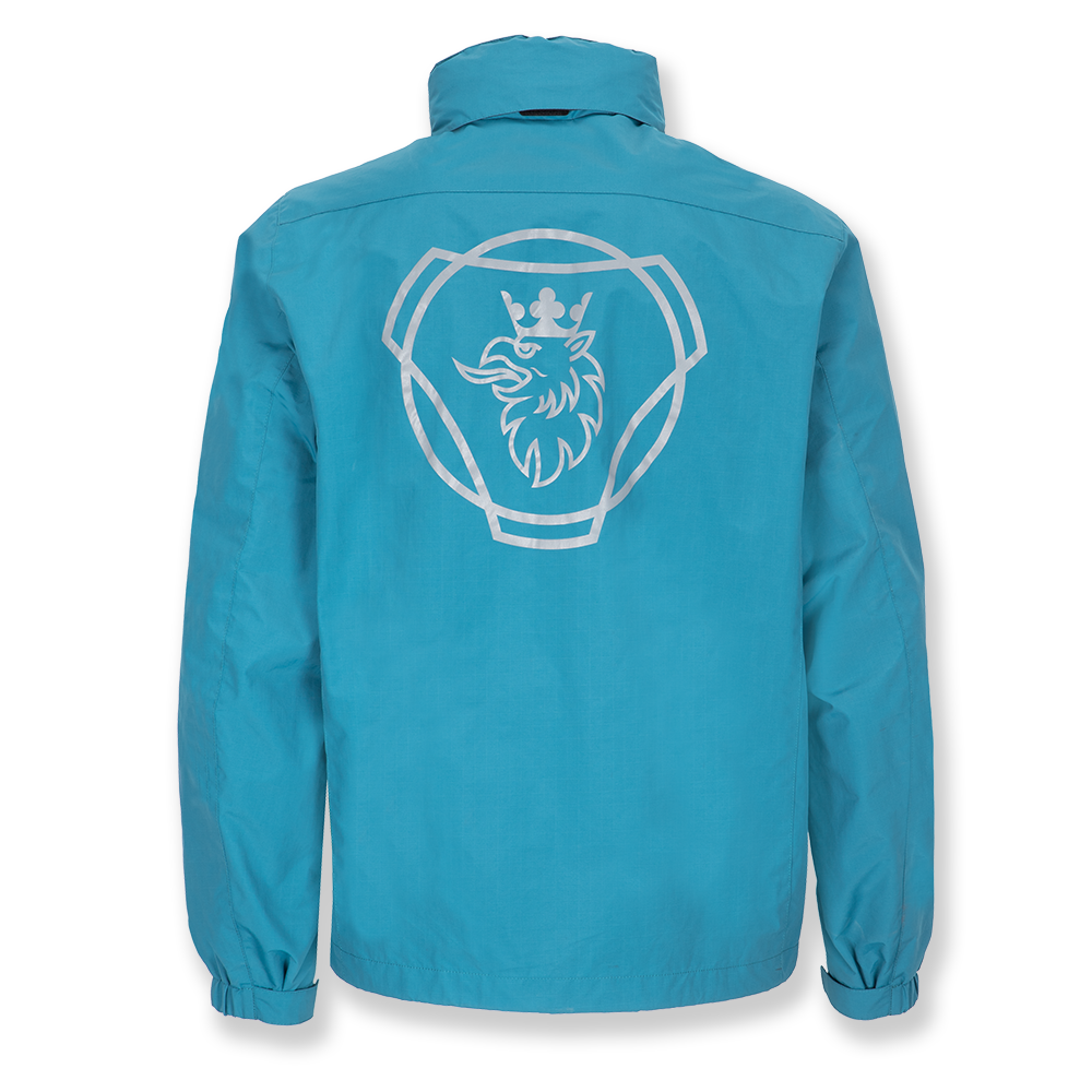 Details: Scania wordmark reflective print on chest and Scania wordmark print at back. Colour contrasting mesh lining and front packets with hidden zippers. Hidden hood in collar, velcro closure. One hand pull drawstring solution at bottom body. Sleeve ends with elastic and adjustable velcro straps.