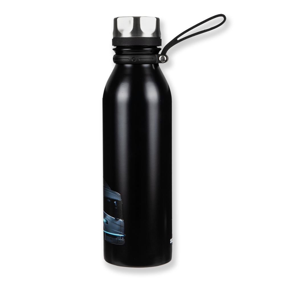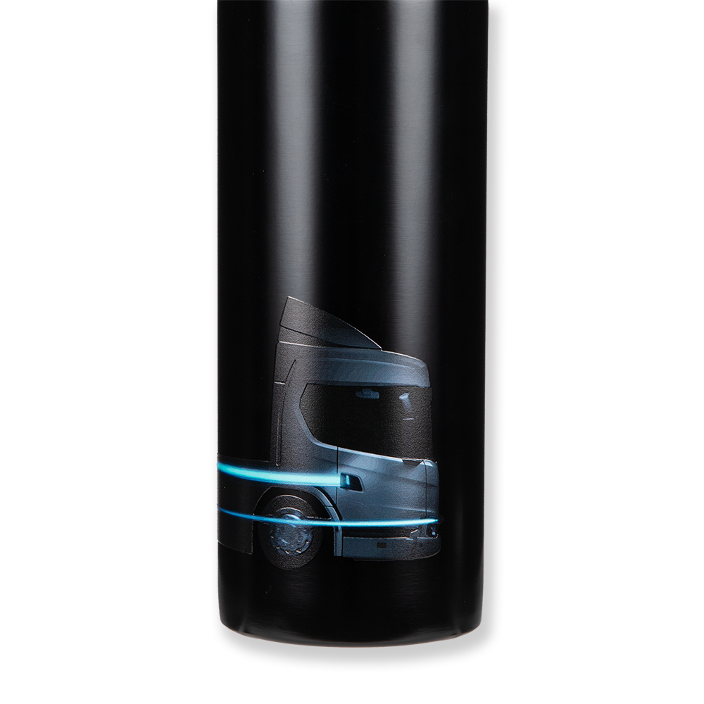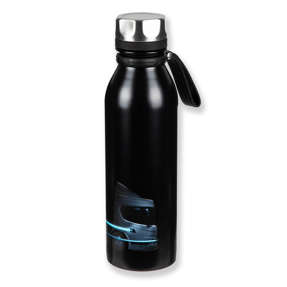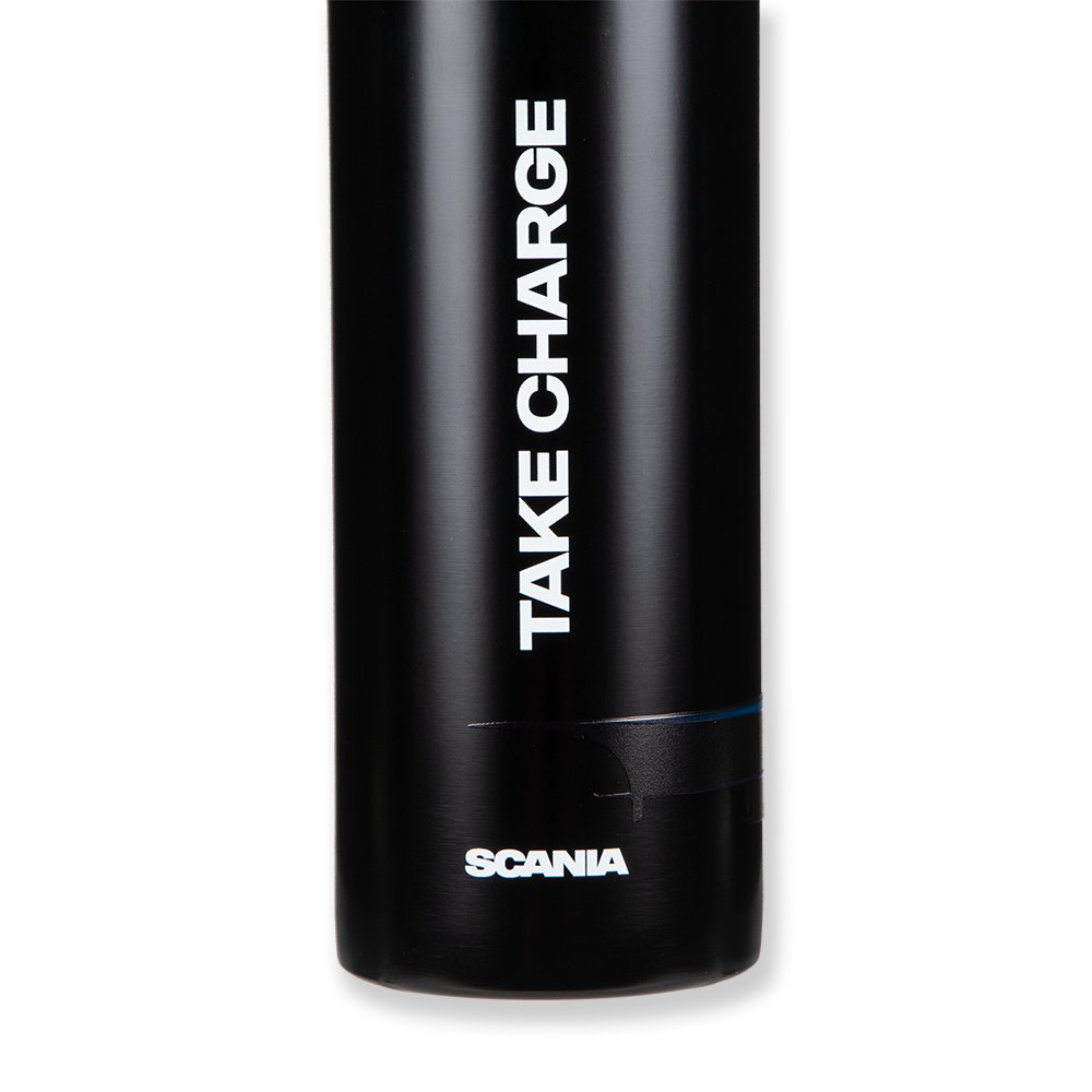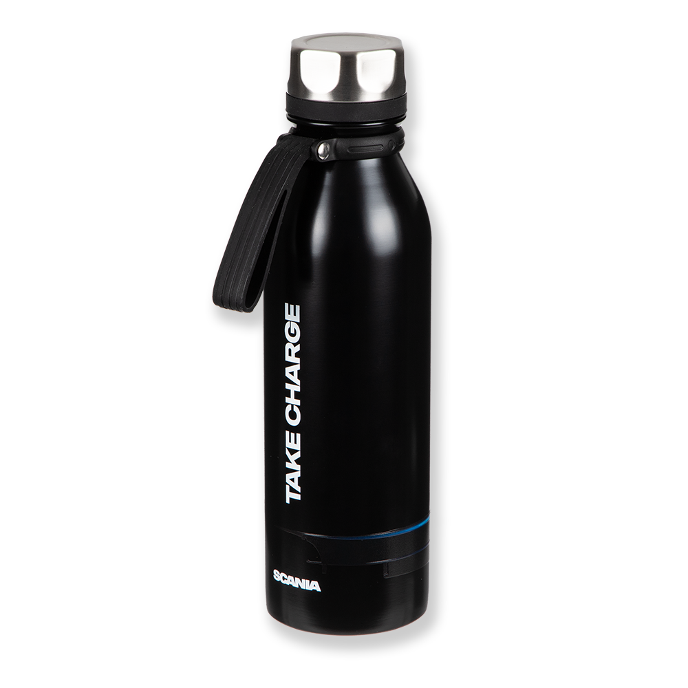 Details: Double wall stainless steel vacuum bottle with easy to carry strap and leakproof screw lid that keeps beverages hot for up to 5 hours and cold for up to 15 hours. Featuring an electric truck print with blue details on one side and Take Charge on the other side. Hand wash recommended.