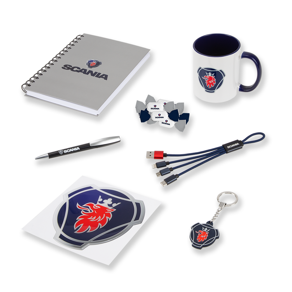 Details: A Scania 4 in 1 Charging Cable with Micro, iPhone Lightning and Type-C connector adaptors; A classic Scania Symbol Mug, 10 Pack of Black Pens, 25 Pack of Symbol Keyrings, 10 Pack of Grey Notebooks, a 10 pack of symbol stickers and 1KG of branded vegan sweets!