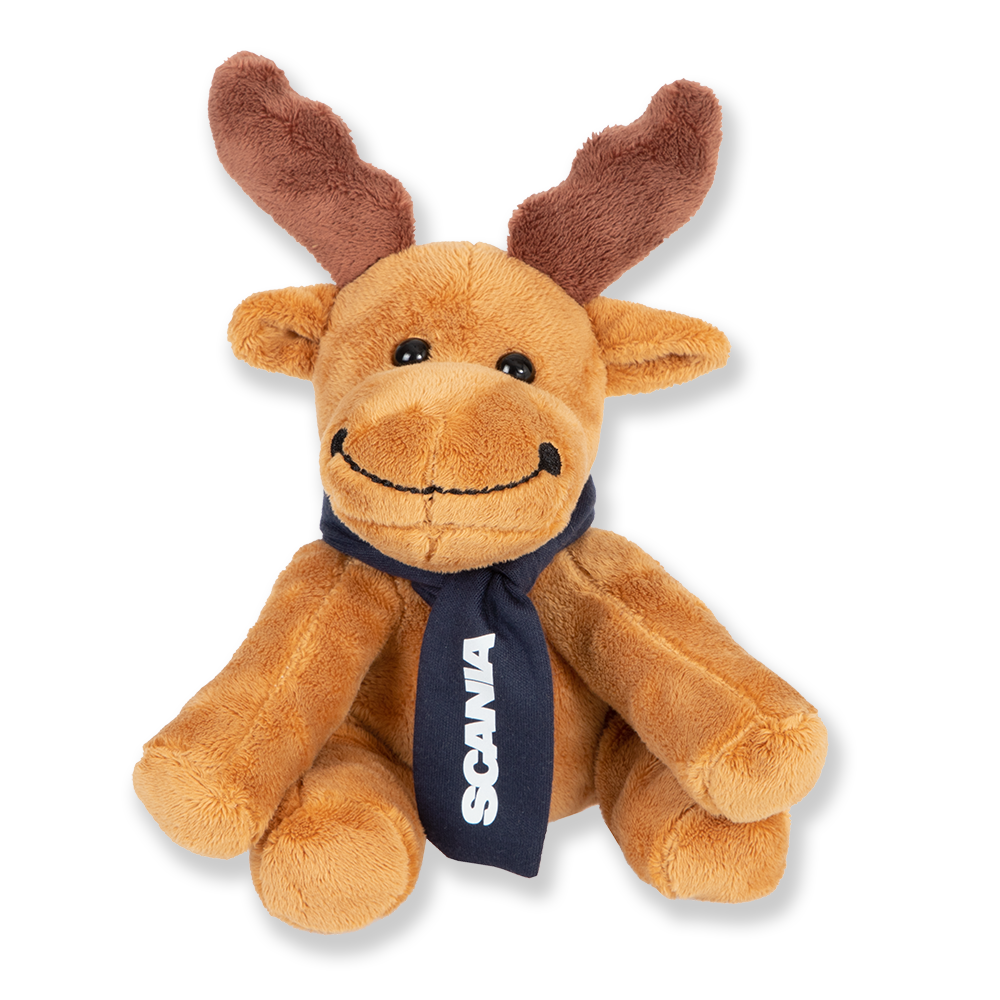 Details: Emil, the super soft plush moose features caramel brown fur, contrasting dark brown antlers and big round eyes, perfect for snuggling up to. Branded with a Scania wordmark doming.