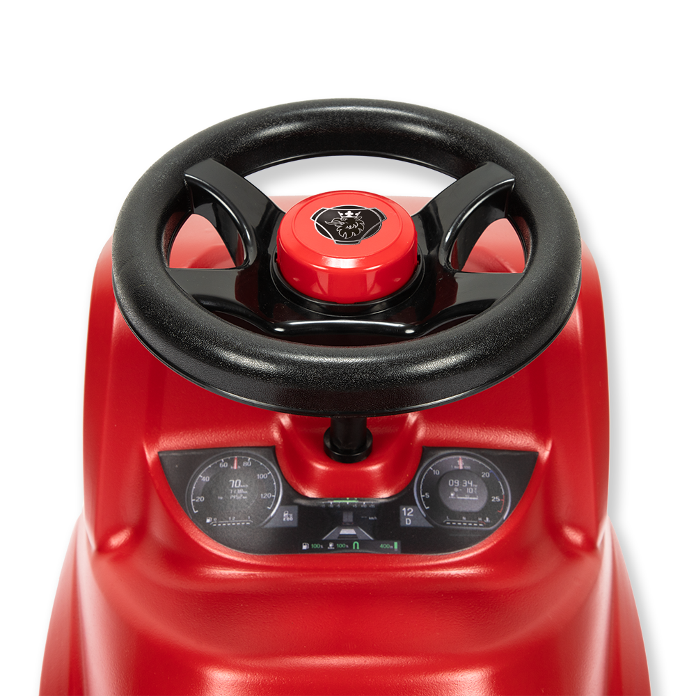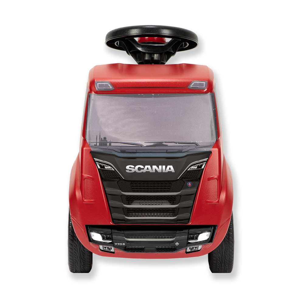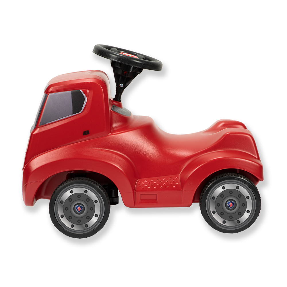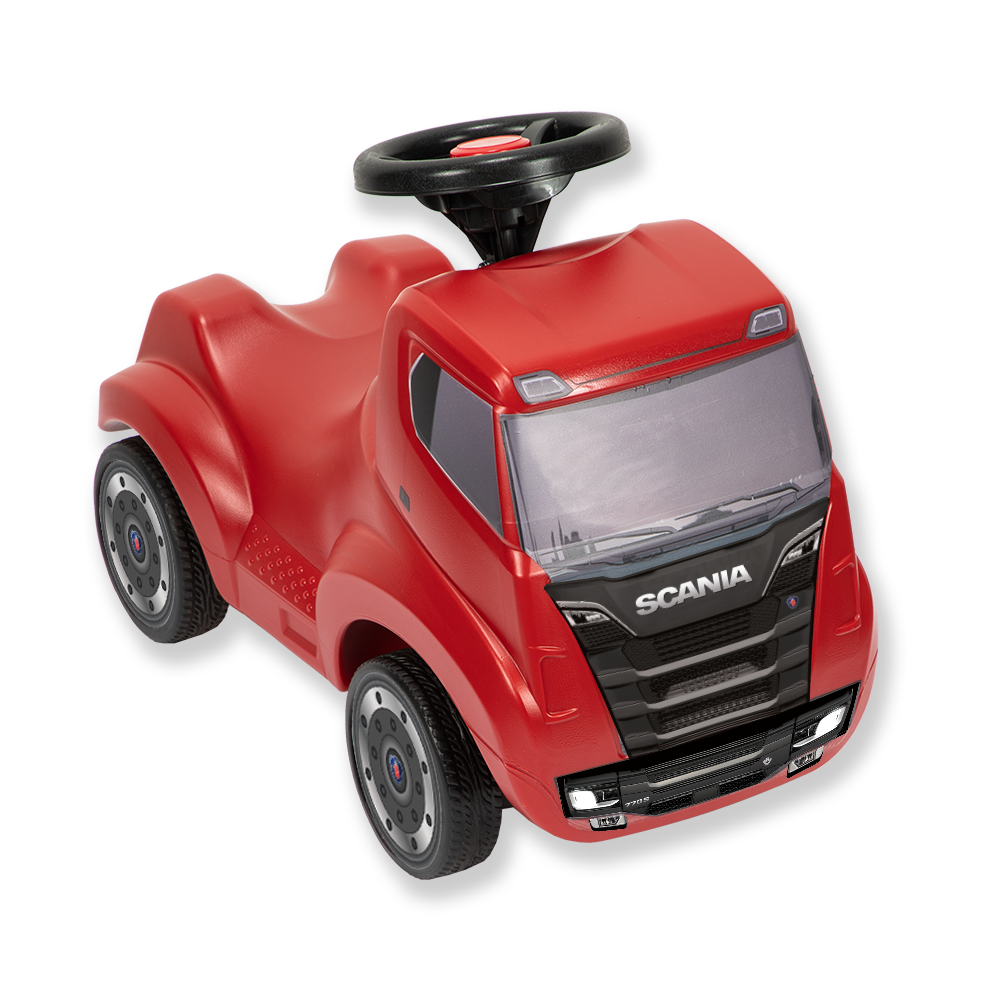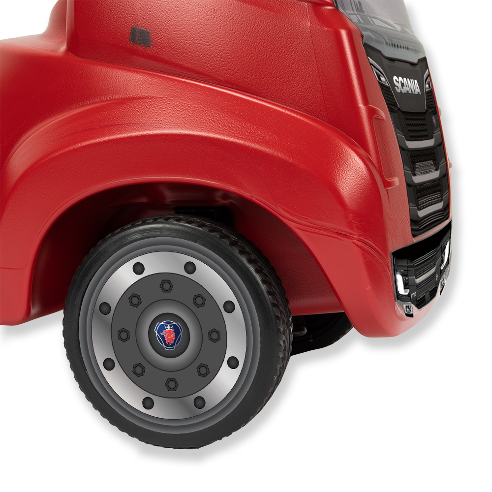 Details: A high-quality robust baby slide truck with ergonomic vehicle contour and foot to floor design to encourage endless movement. Fitted with a steering wheel and horn, 4 wheels with matching Scania truck tyre stickers and a knee rest for total comfort. Finished with a Scania truck decal on the front. Suitable for ages: 1½ - 4 years .