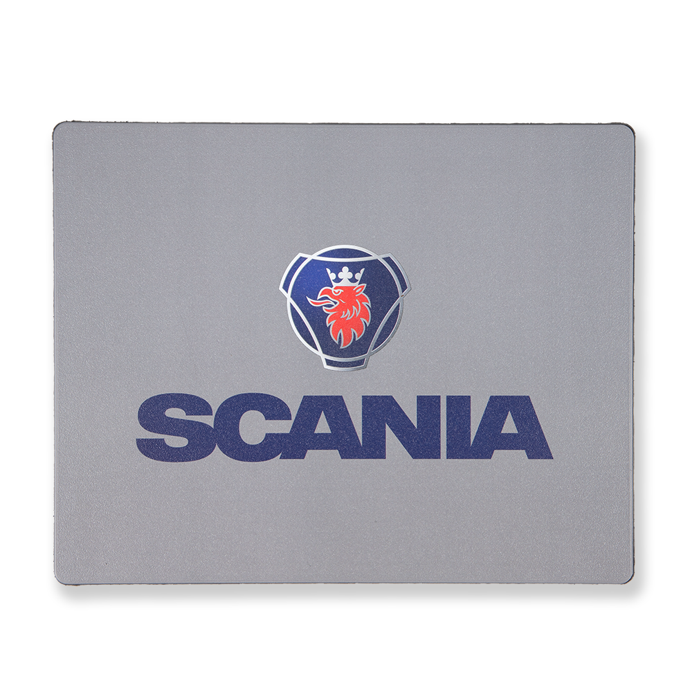 Mouse mat designed to work with standard balled and optical mice. Scania logotype across the centre.