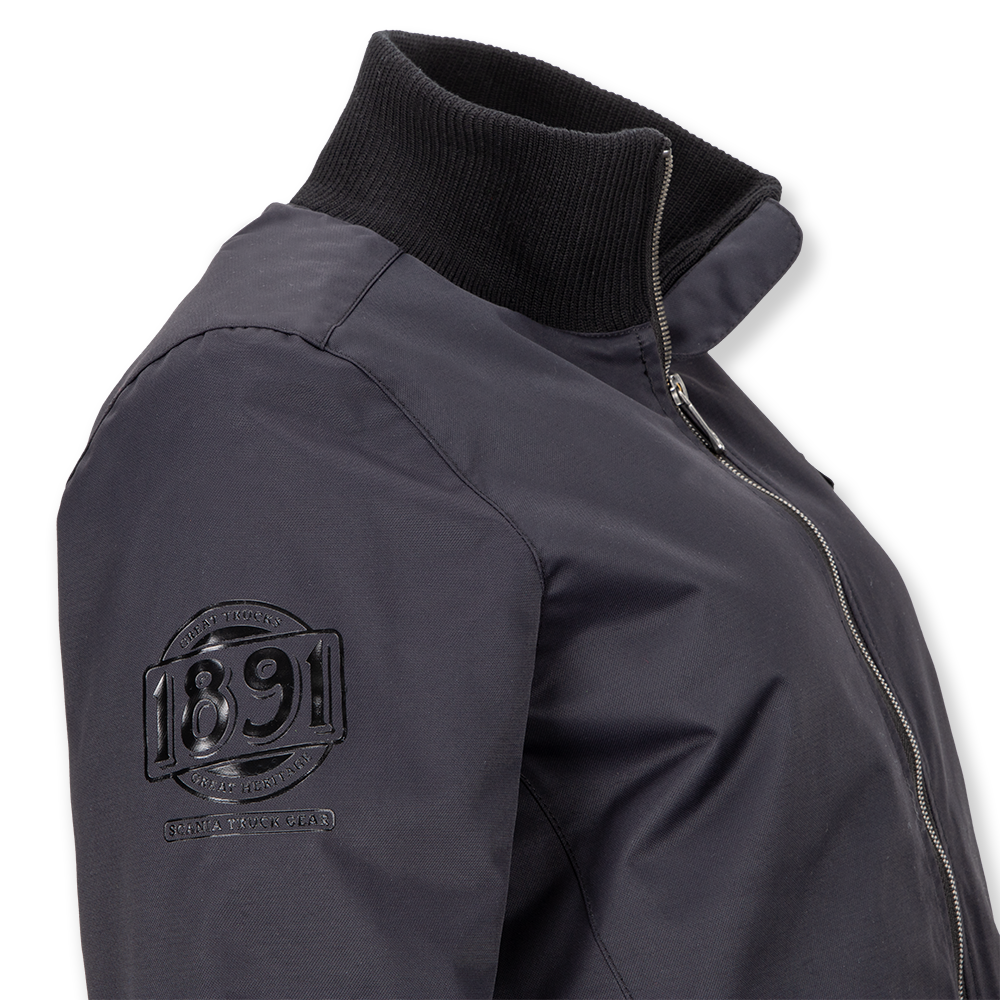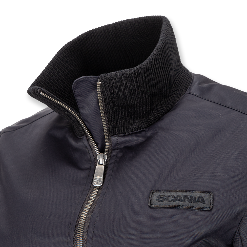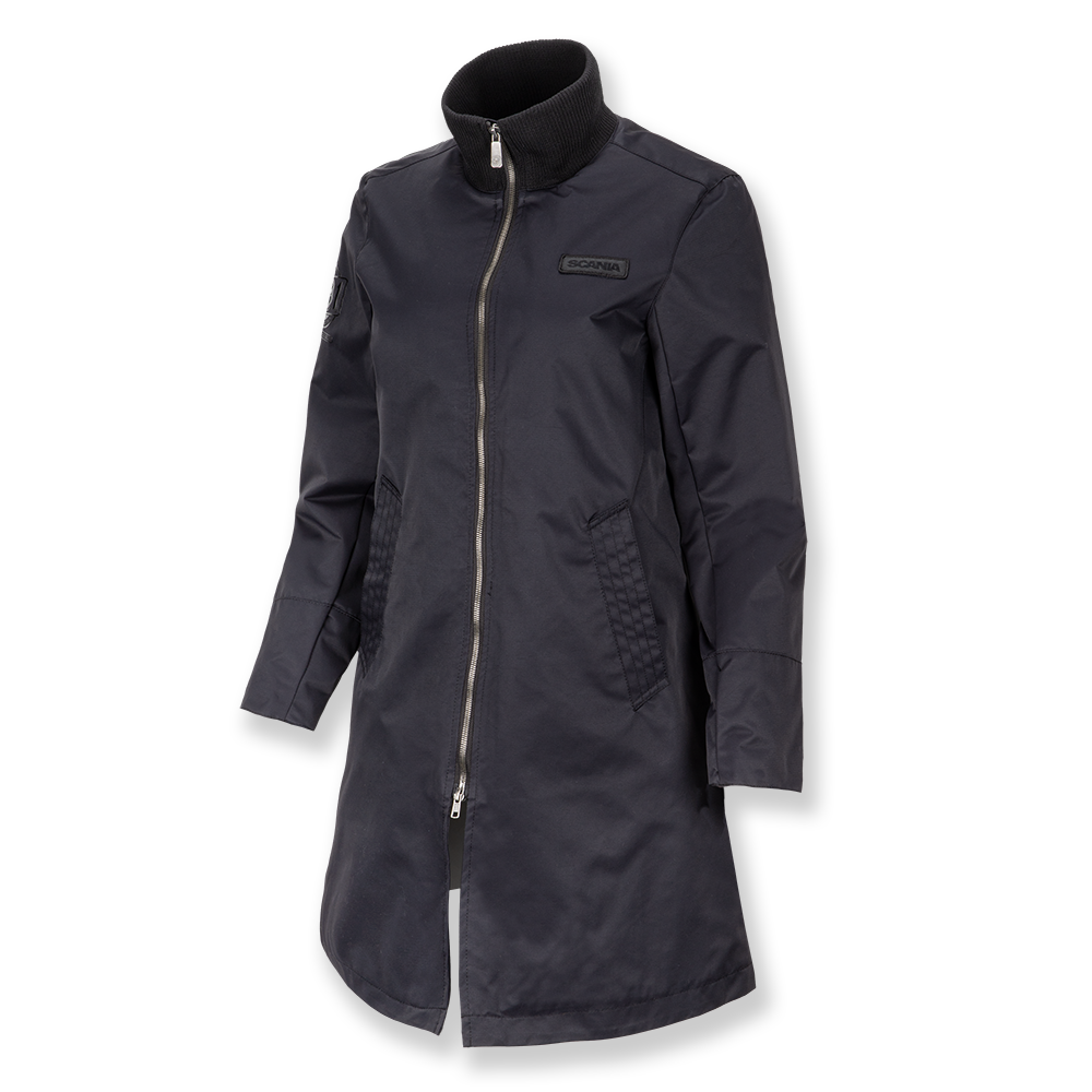 Straight, fitted coat with rib-knitted collar. Scania logo badge on the chest, embroidered cropped griffin on the back, rubber print on sleeve, all tone in tone. Shell: 100% nylon. Lining: 75% nylon, 25% polyester.