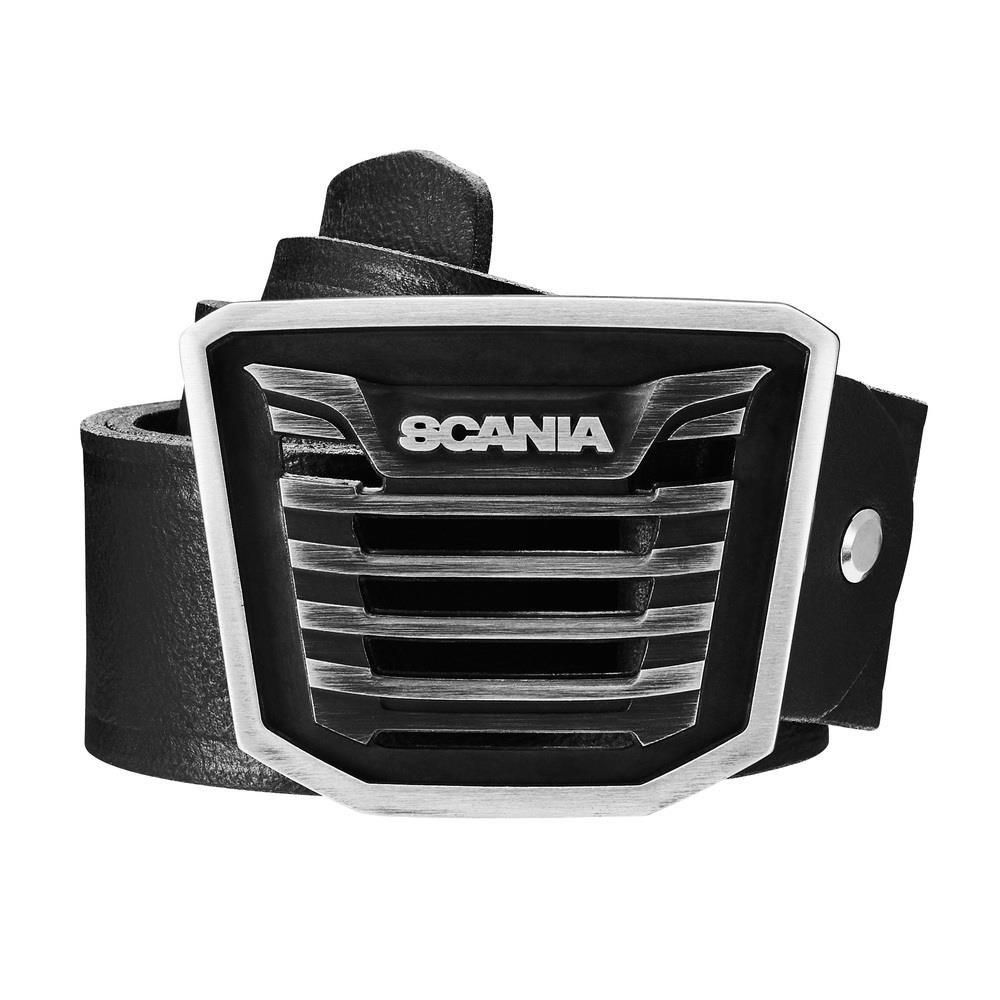 Leather belt with Scania front grill buckle. 130 cm long, adjustable length. 100% leather belt, metal buckle.