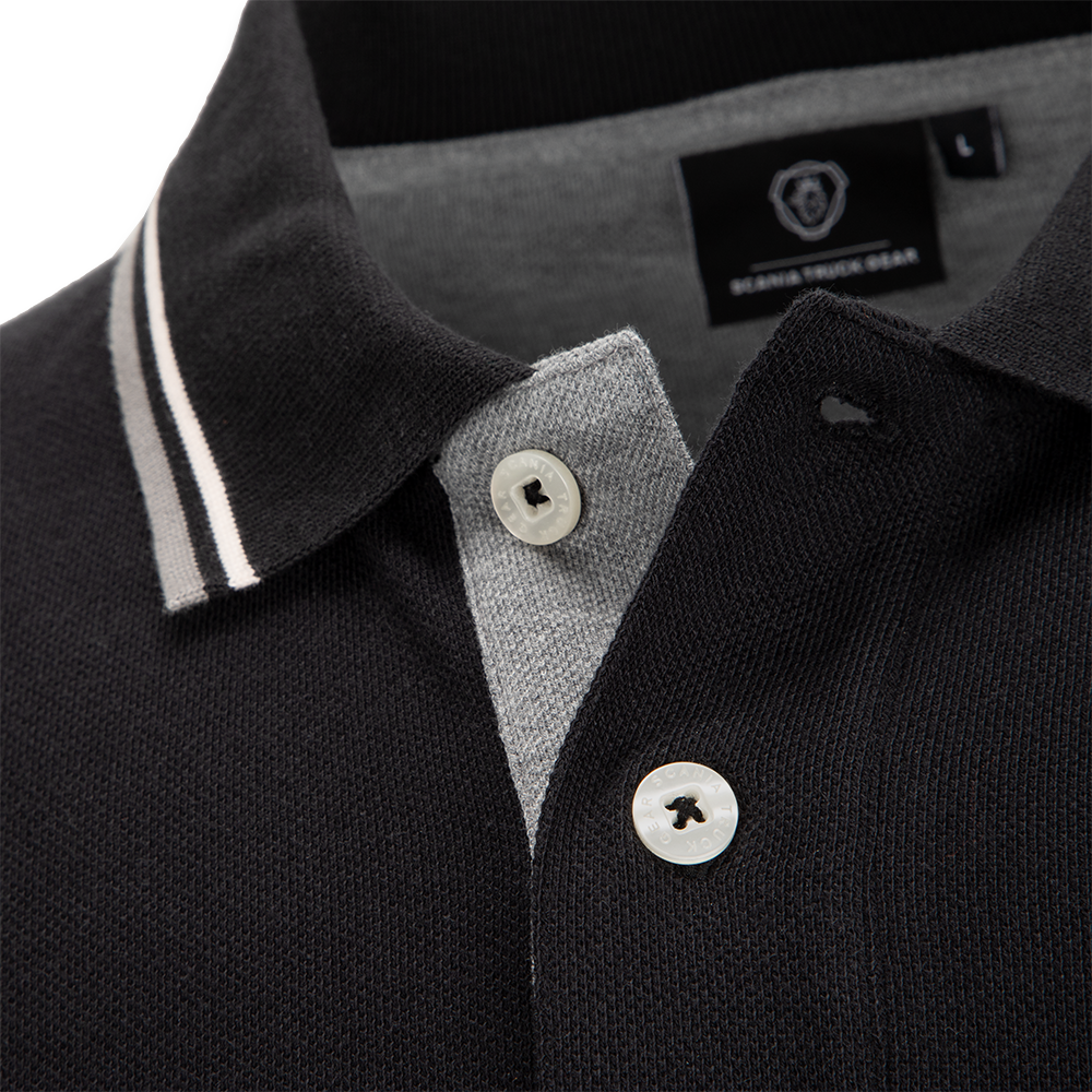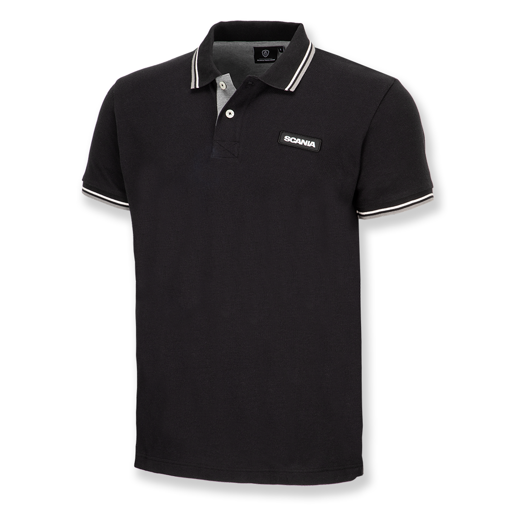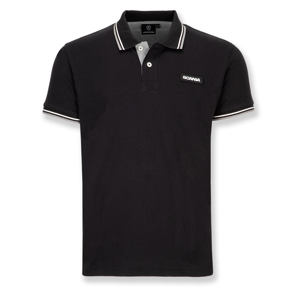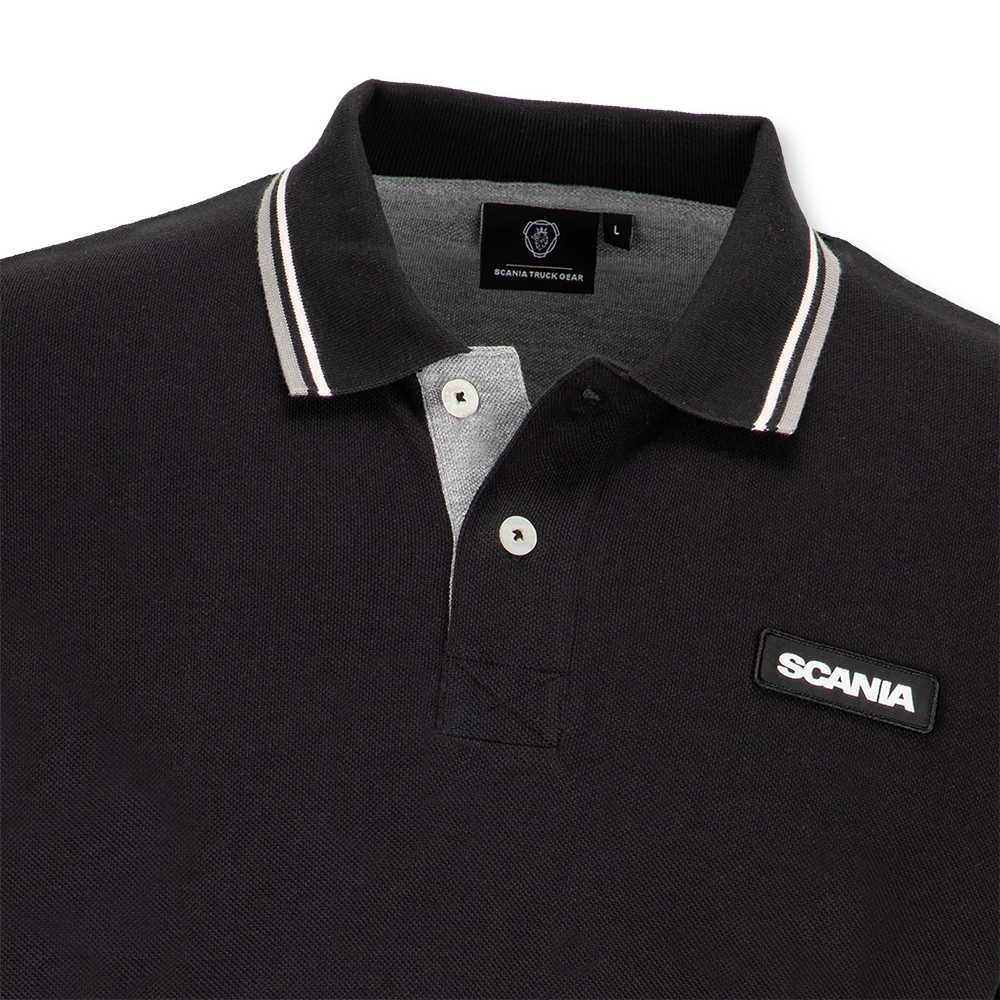 Details: Scania wordmark on chest, contrast colour stripes on collar and cuffs, longer back than front, split side.