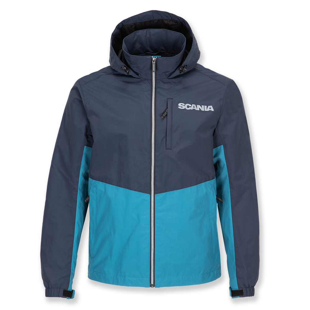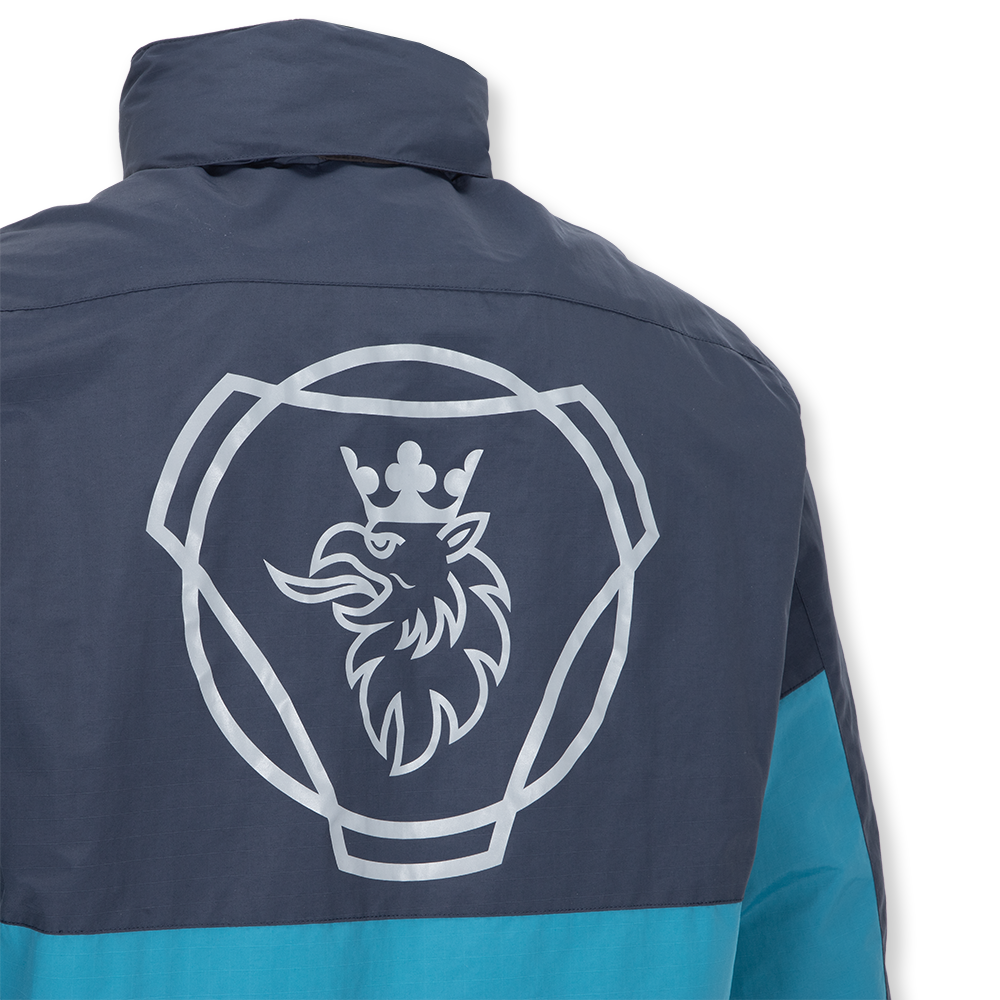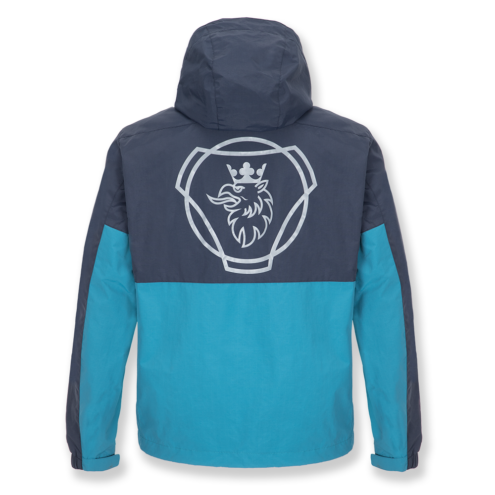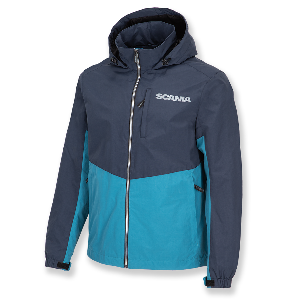 Details: Duo tone look. Scania wordmark reflective print on chest and Griffin symbol in reflective silver at back. Colour contrasting mesh lining and front packets with hidden zippers. Hidden hood in collar, velcro closure. One hand pull drawstring solution at bottom body. Sleeve ends with elastic and adjustable velcro straps.