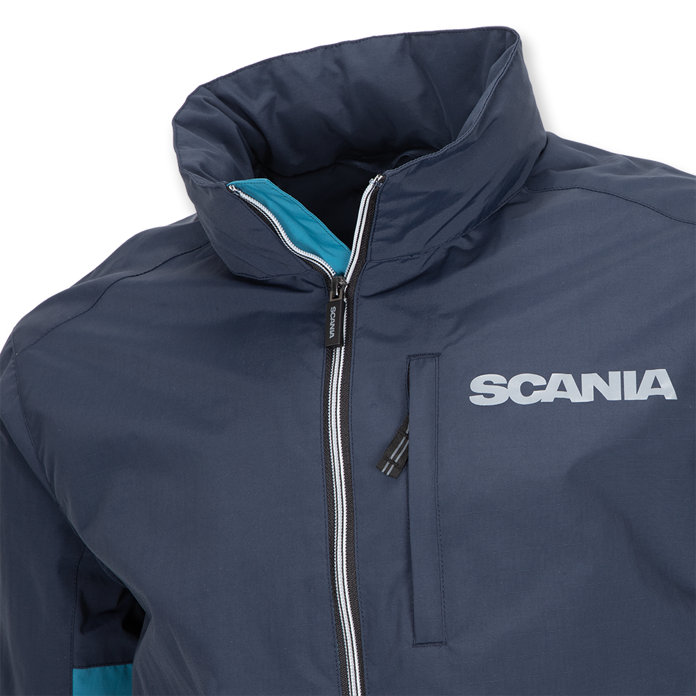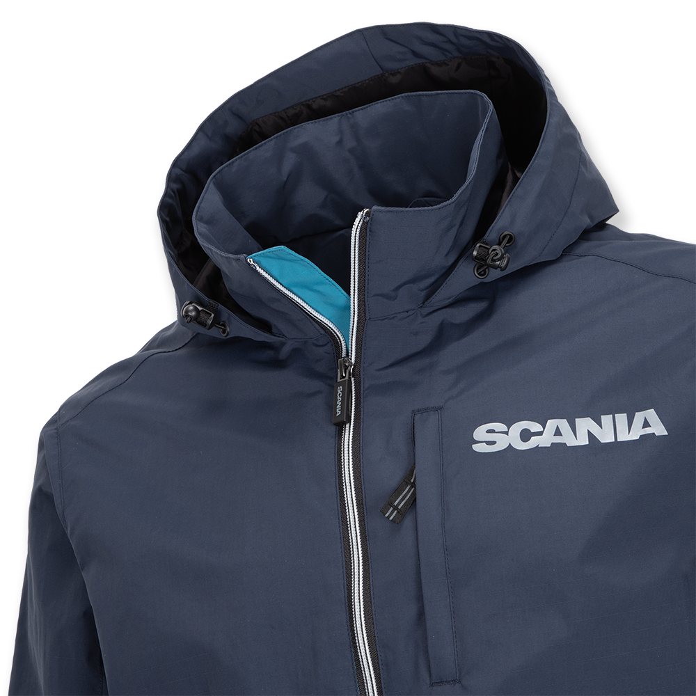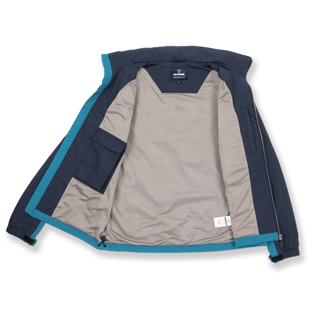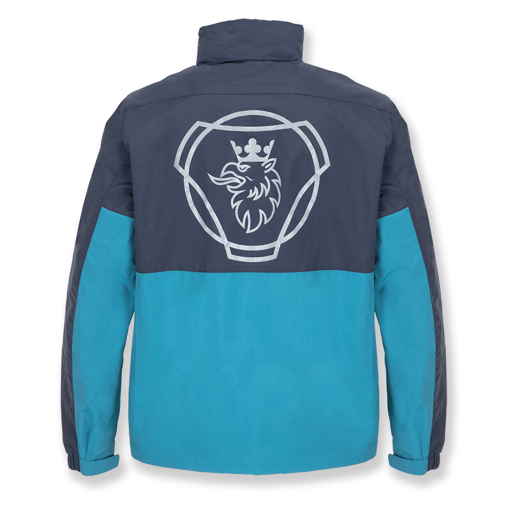 Details: Duo tone look. Scania wordmark reflective print on chest and Griffin symbol in reflective silver at back. Colour contrasting mesh lining and front packets with hidden zippers. Hidden hood in collar, velcro closure. One hand pull drawstring solution at bottom body. Sleeve ends with elastic and adjustable velcro straps.