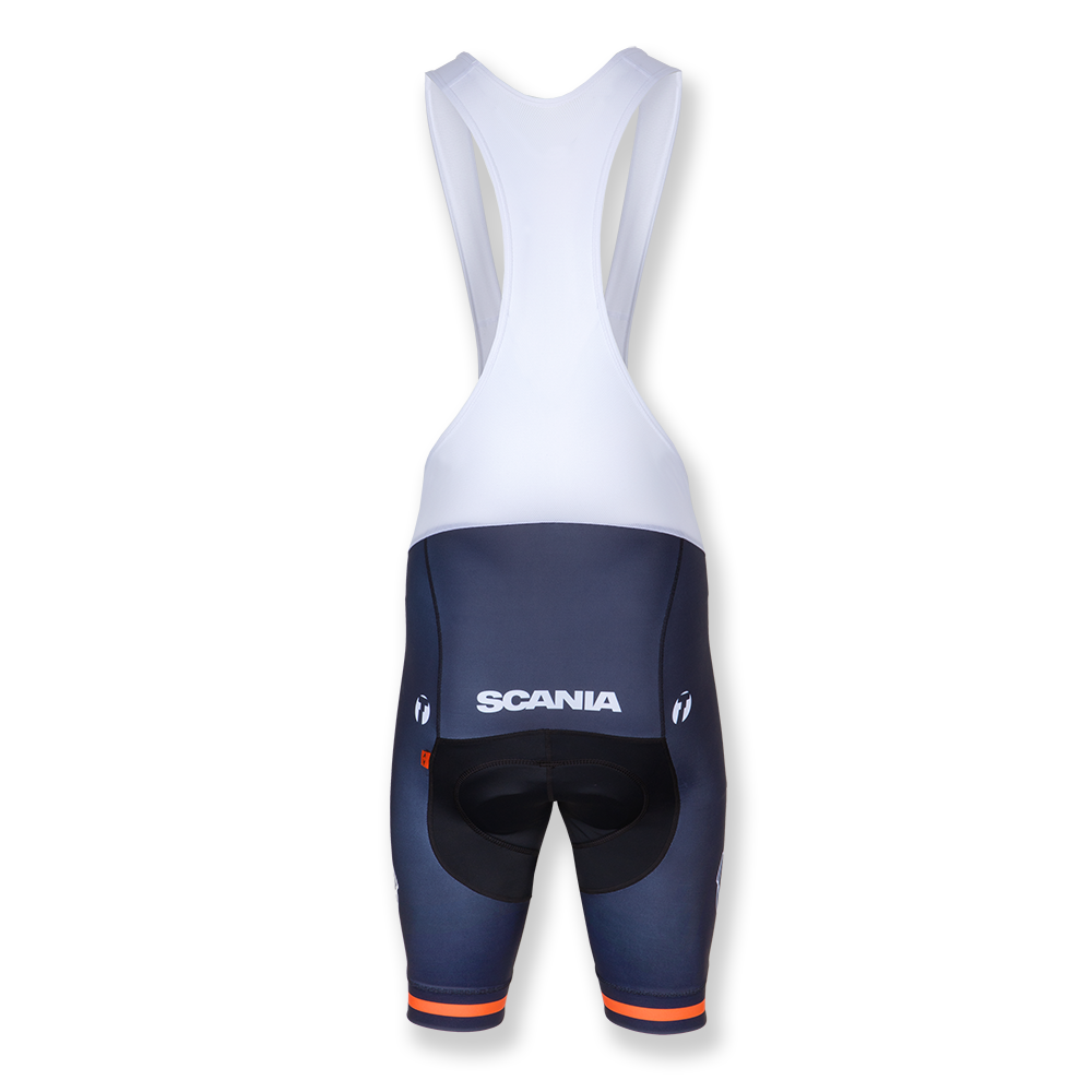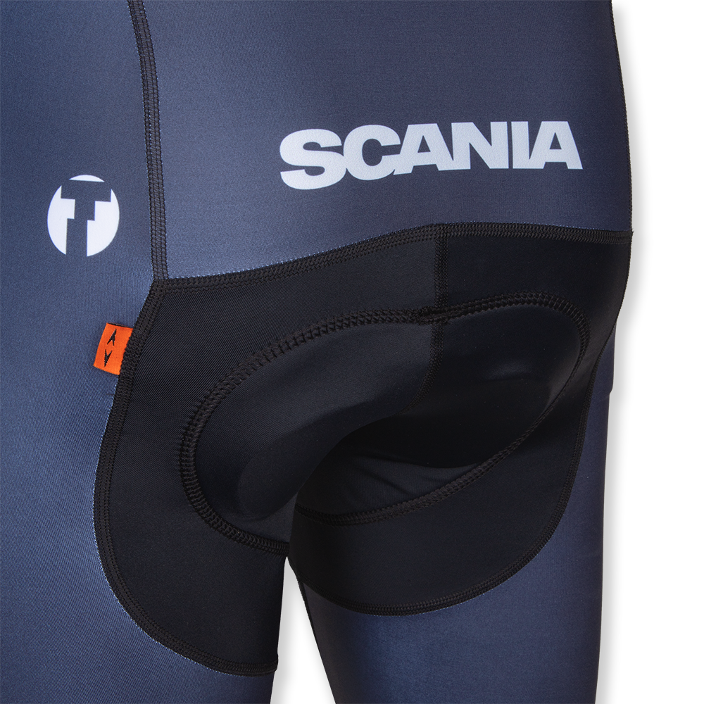 Details: Lightweight and breathable bib shorts, made from stretchy Lycra. Especially designed padding for men, specifically for protection and mobility. Scania symbol on the leg, Scania wordmark on the back. Made by Trimtex .