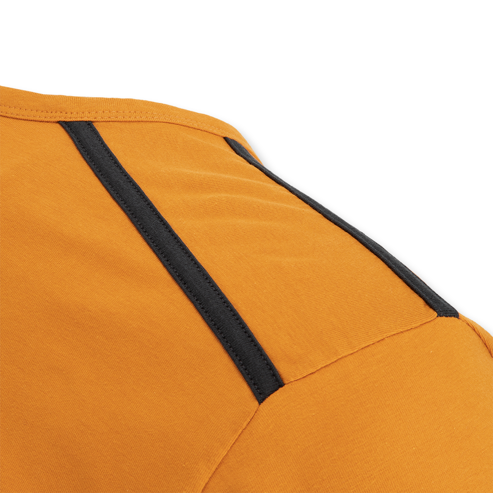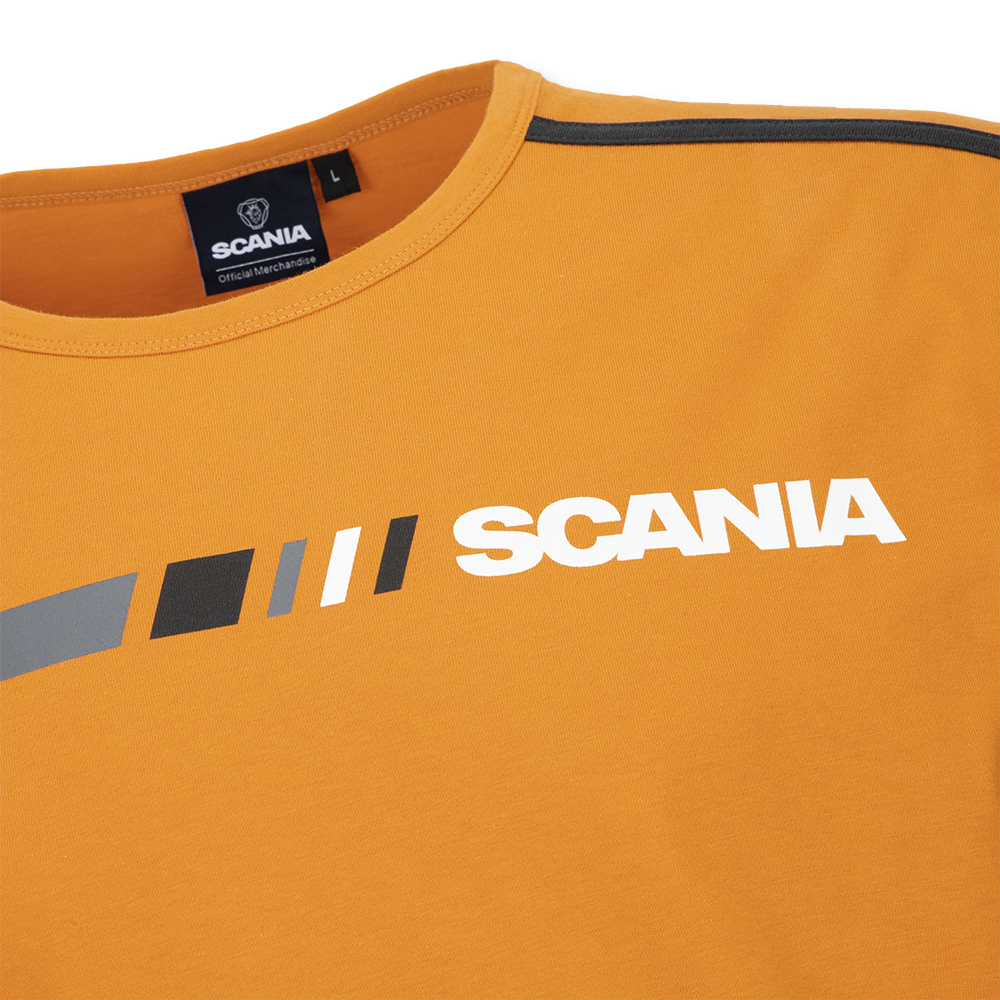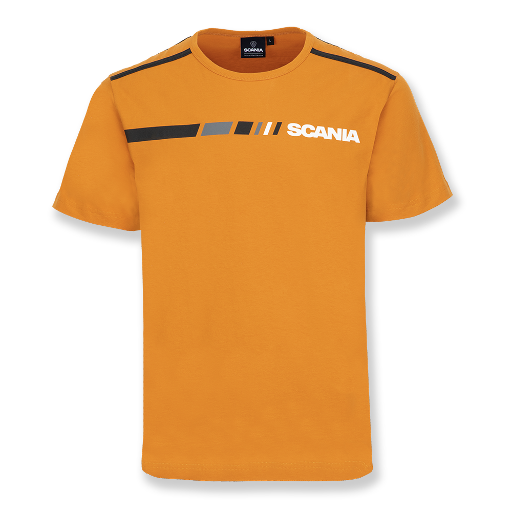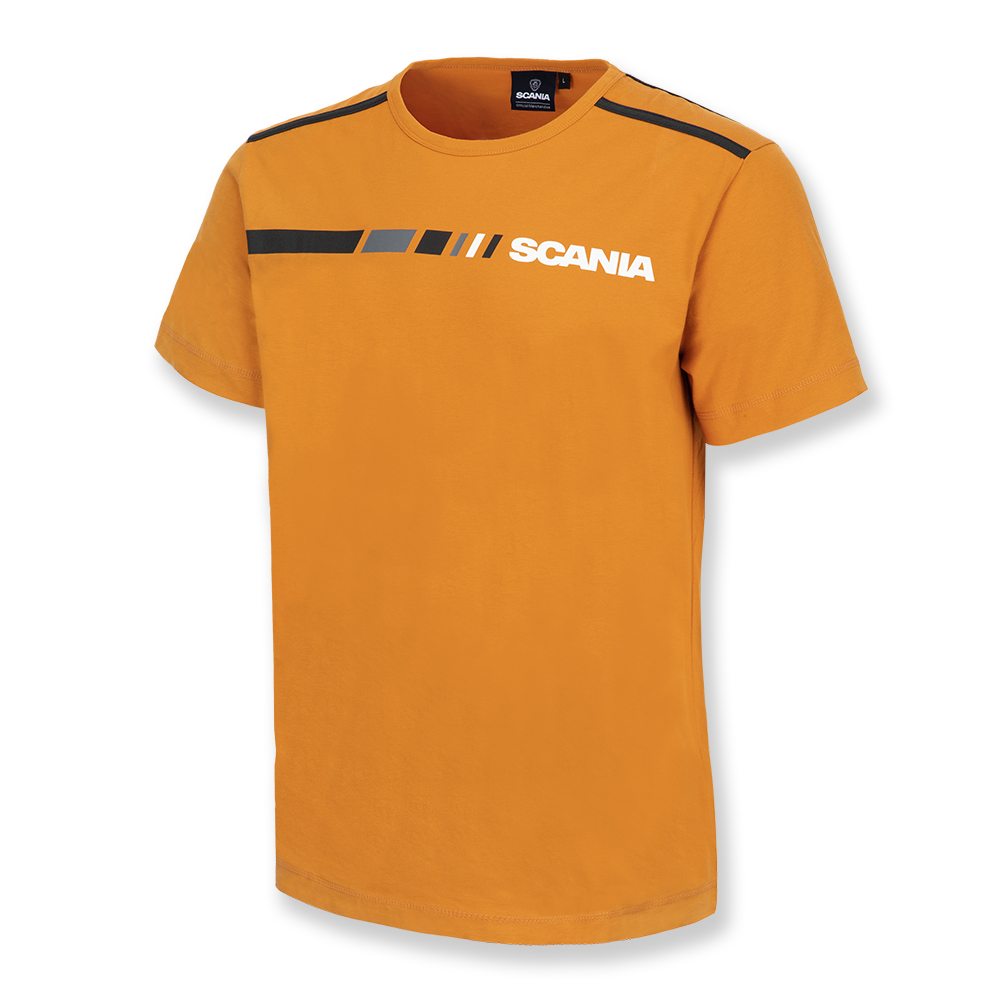 Details: T-Shirt with block stripe and Scania Workmark. Contrast tapes at shoulders. Contrast and heavy chainstitch at the shoulders.