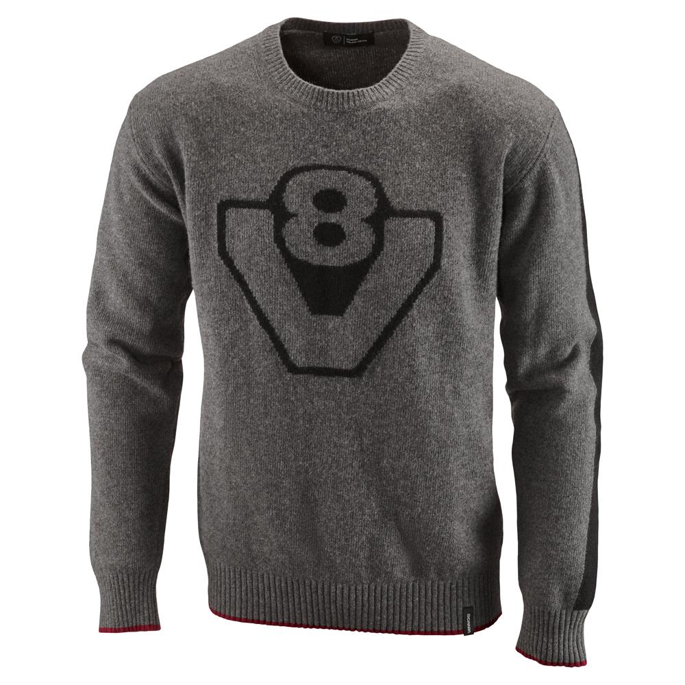 Details: Red contrast colour stripe on sleeves and bottom hem, V8 logo knitted on chest.