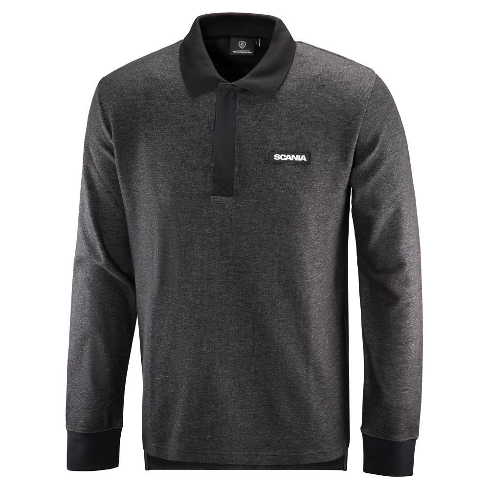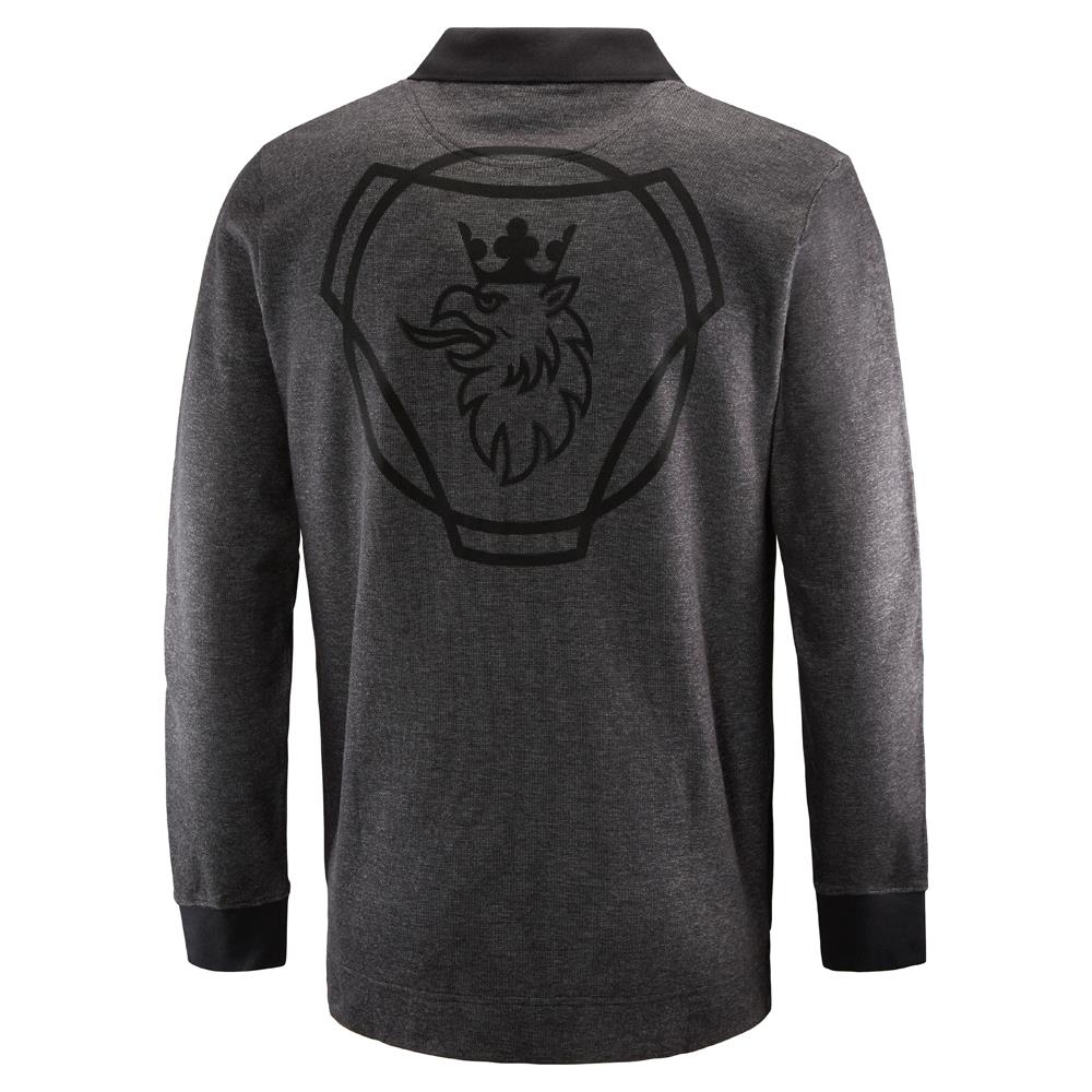 Details: Scania Symbol on back, Scania wordmark badge on chest. Hidden buttons, side seam slits, solid colour ribs on collar and cuffs.