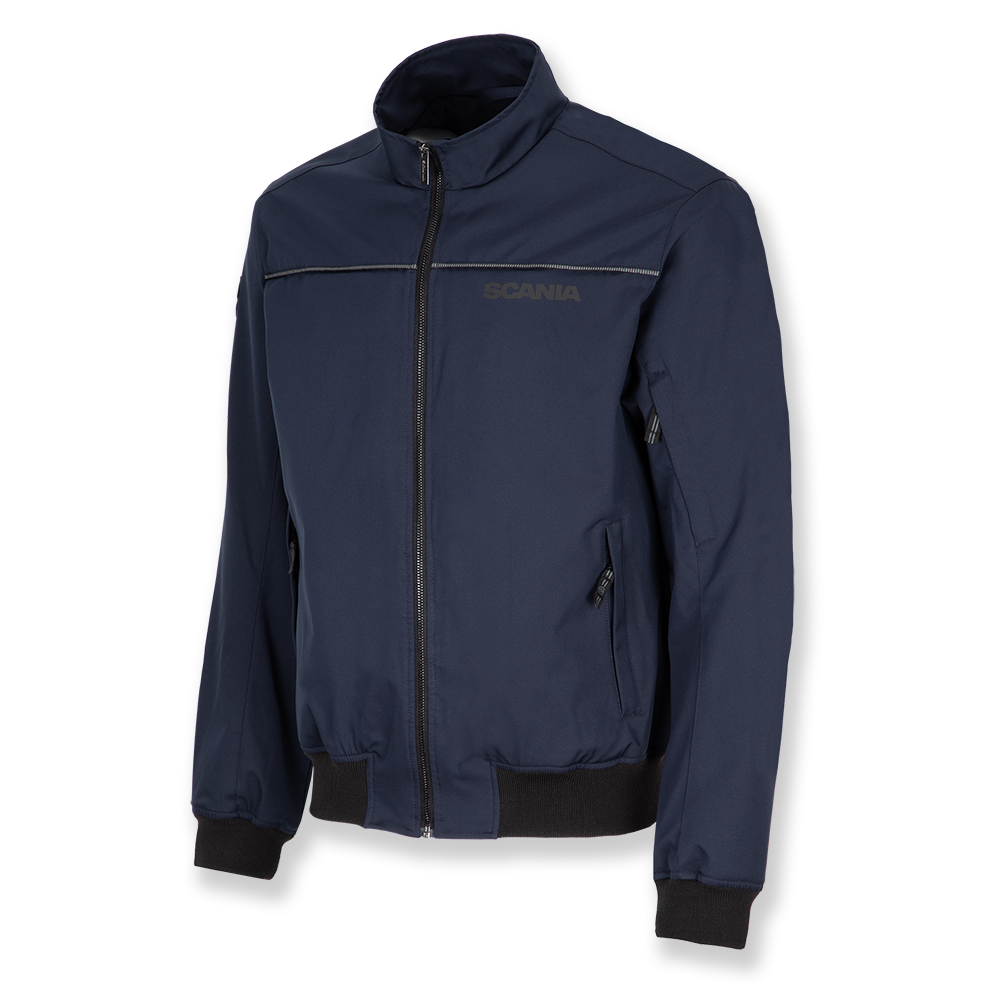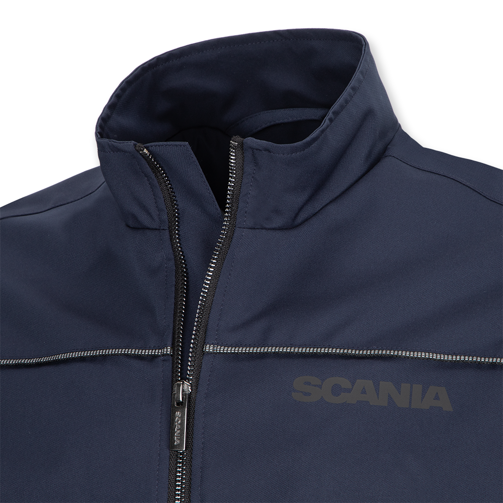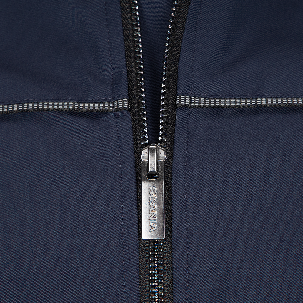Details: Scania wordmark print on chest, original symbol 3-colour badge on sleeve. Ribbed cuffs at bottom and sleeve. Reflective piping with on front and back. Metal front zipper with logo puller.