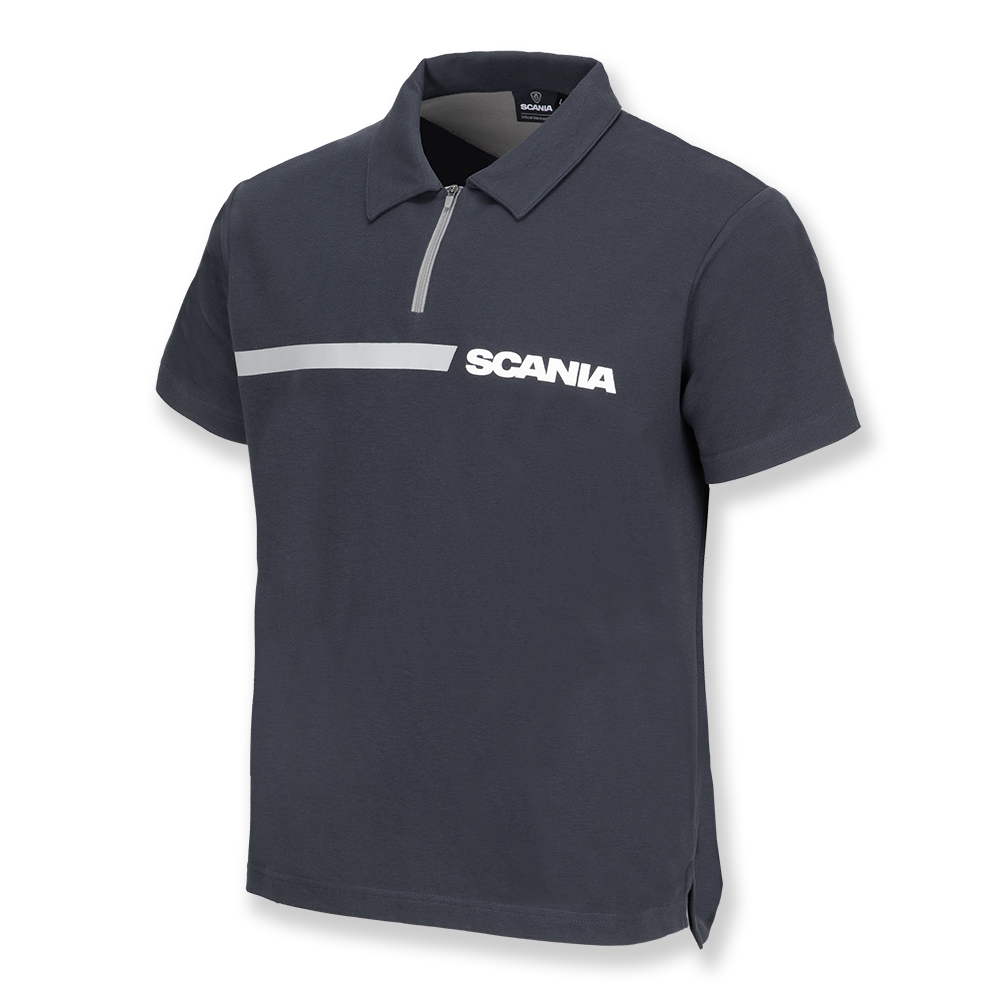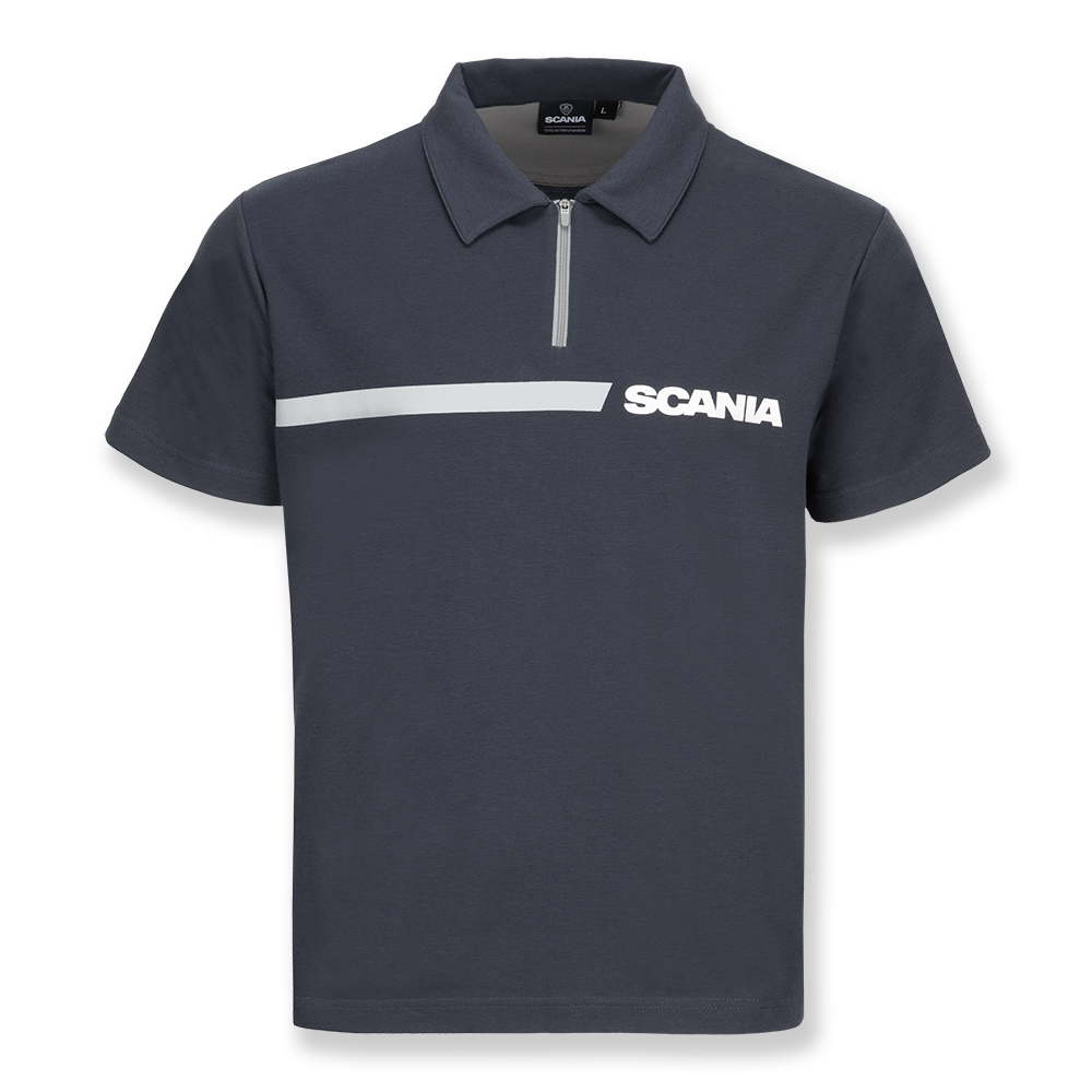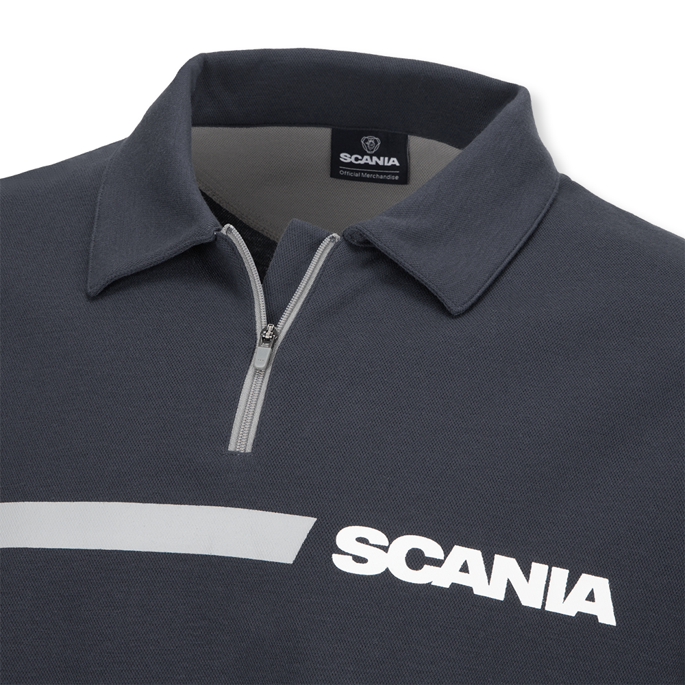 Details: 1/4 Zip Polo with a grey printed stripe and Scania Wordmark across the chest. Dropped split hem.