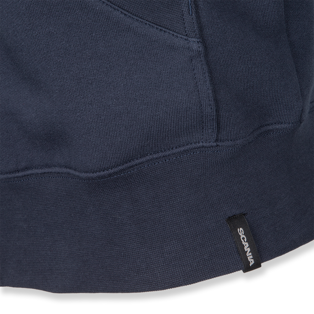 Details: Regular fit hoodie with kangaroo pocket. Colour contrast detailinand finished with nylon zipper and pulls. Scania heritage wordmark duo colour patch on chest. Inside brushed.