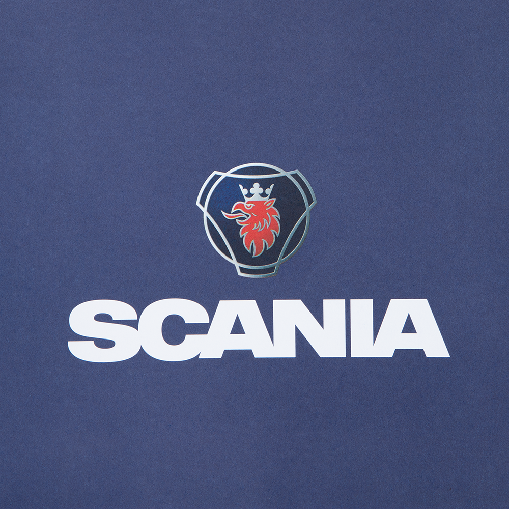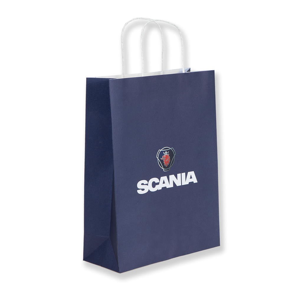 Scania blue, with white twisted paper handles. Scania full colour logo printed to both sides.