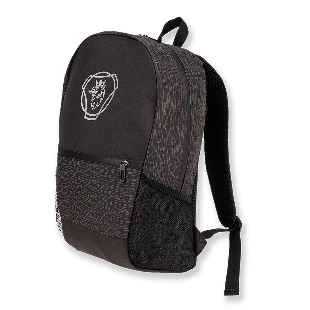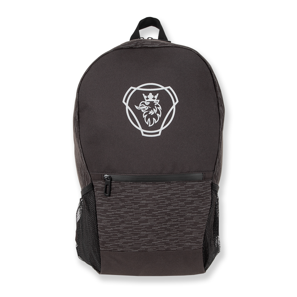 Details: A lightweight backpack featuring a modern all-over reflective print, main compartment for up to 15.6" laptop, front zipper pocket and 2 mesh pockets. Adjustable straps. Branded with the Scania Symbol in reflective on the front of the backpack.