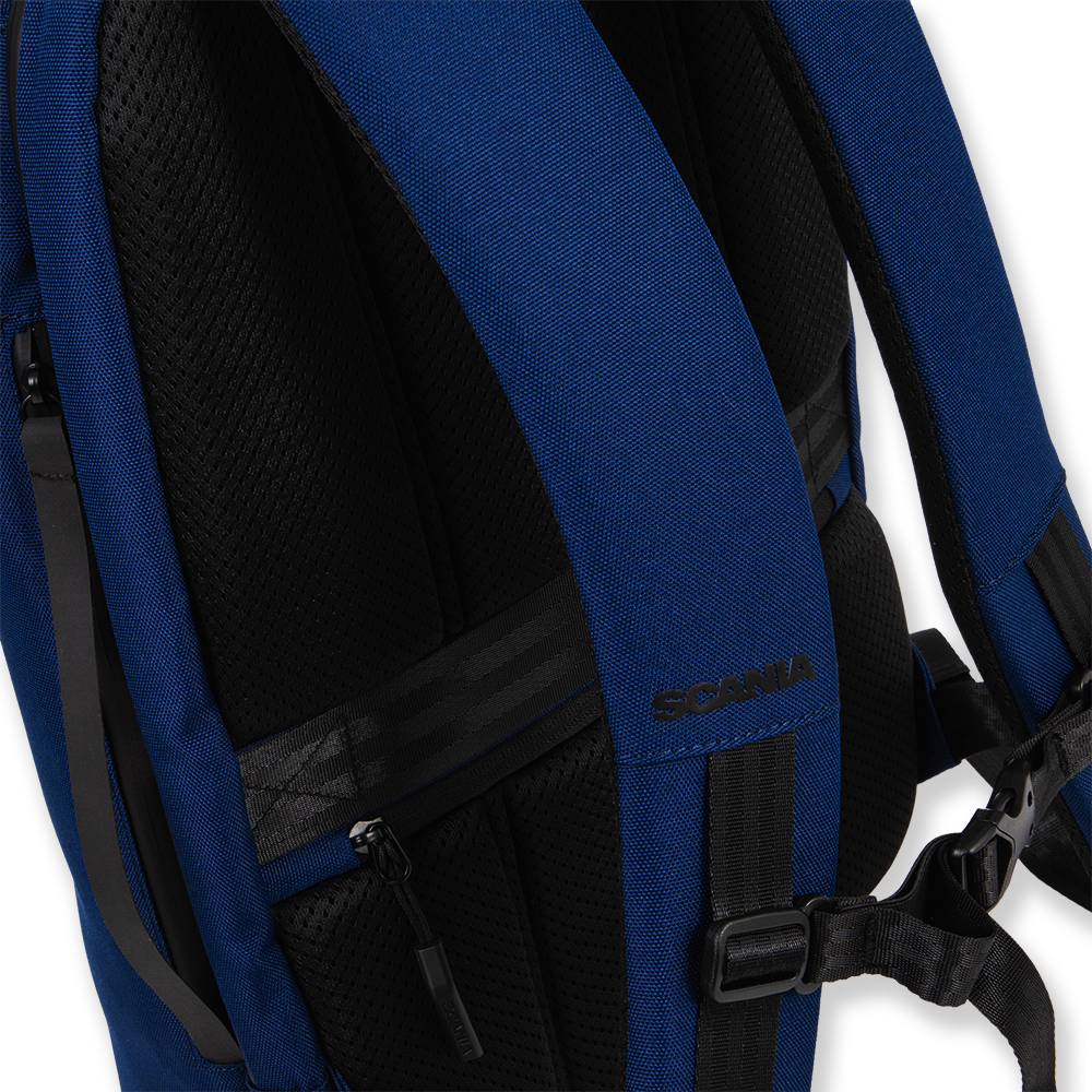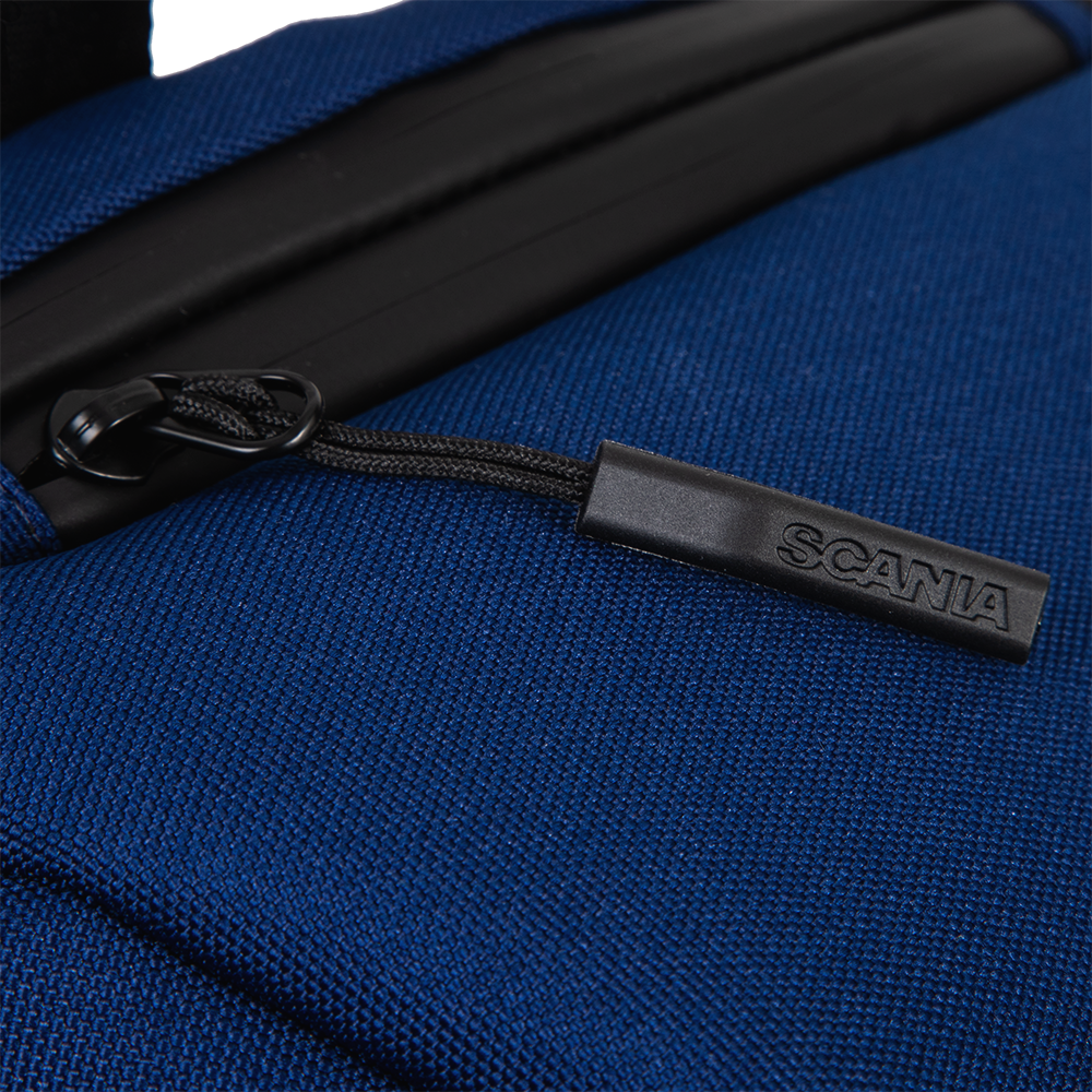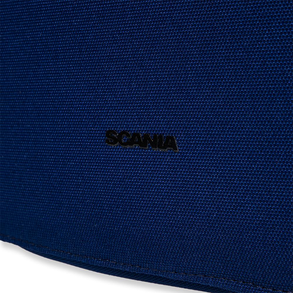 Details: This Scania blue backpack features adjustable straps, a black top handle and black inside lining and mesh compartment. The front of the backpack contains a large zipped pocket and encorporates a unique flap over the top with two strong maegnetic clips to the side. In the back, there is a zipped compartment suitable for storing tablets and other work items. The Scania wordmark in black 3D silk print is also featured on the bottom front centre of the backpack, the right shoulder strap and inside lining tablet pocket. Scania branded zippers in tonal black. Magnetic clips on front flap. Trolley strap. Scania wordmark printed on inside lining tablet pocket.