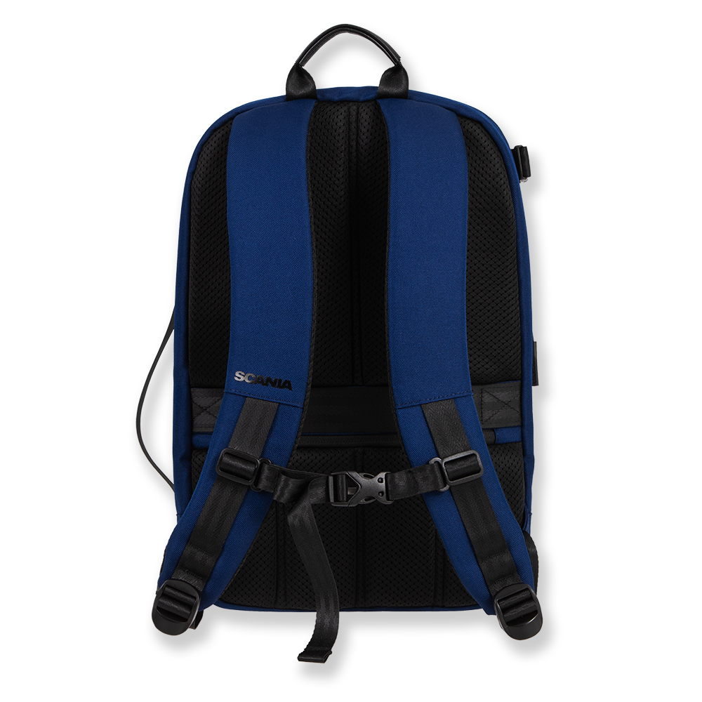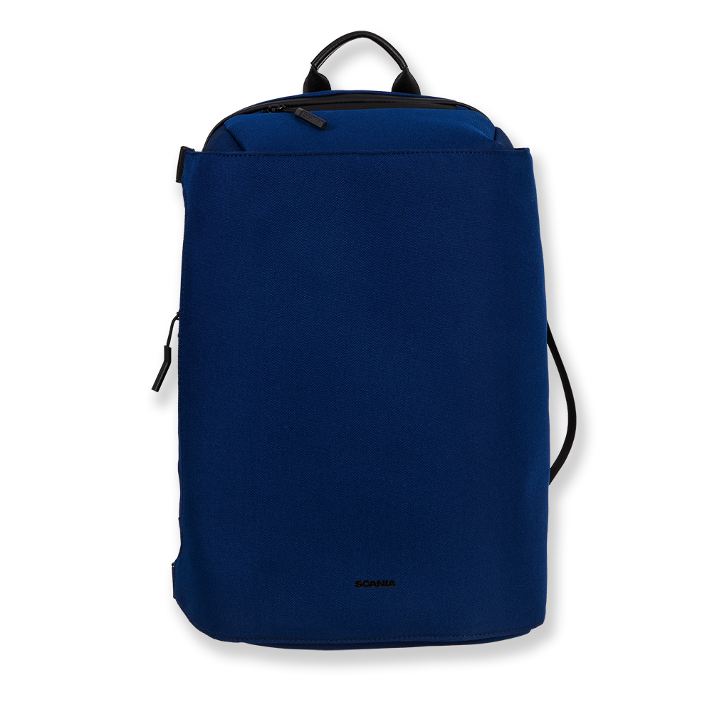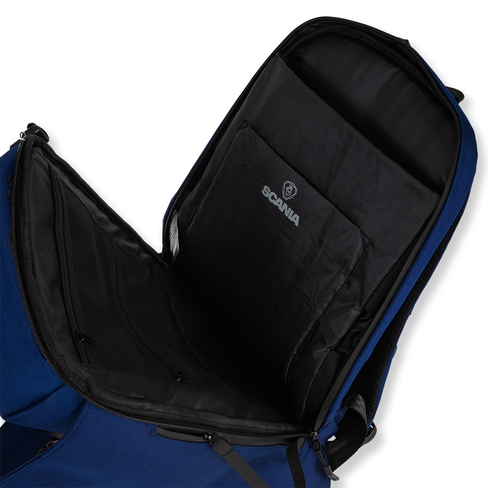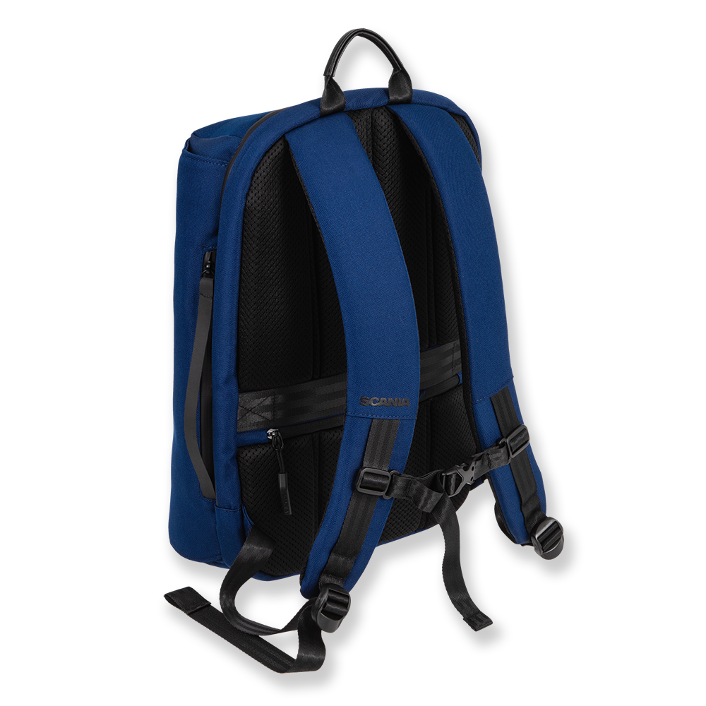 Details: This Scania blue backpack features adjustable straps, a black top handle and black inside lining and mesh compartment. The front of the backpack contains a large zipped pocket and encorporates a unique flap over the top with two strong maegnetic clips to the side. In the back, there is a zipped compartment suitable for storing tablets and other work items. The Scania wordmark in black 3D silk print is also featured on the bottom front centre of the backpack, the right shoulder strap and inside lining tablet pocket. Scania branded zippers in tonal black. Magnetic clips on front flap. Trolley strap. Scania wordmark printed on inside lining tablet pocket.