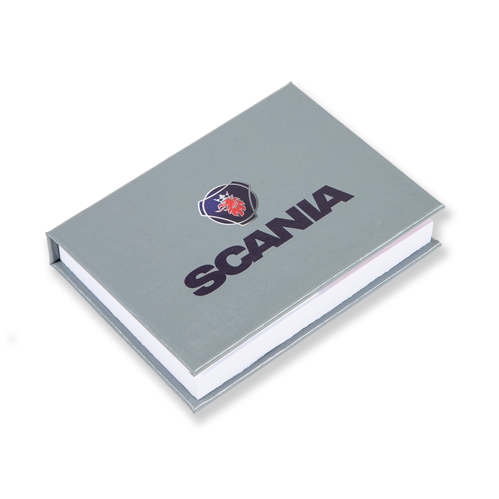 Details: Notebook with two notespads Includes 5 sets of neon coloured page markers. Scania logotype on front of case.