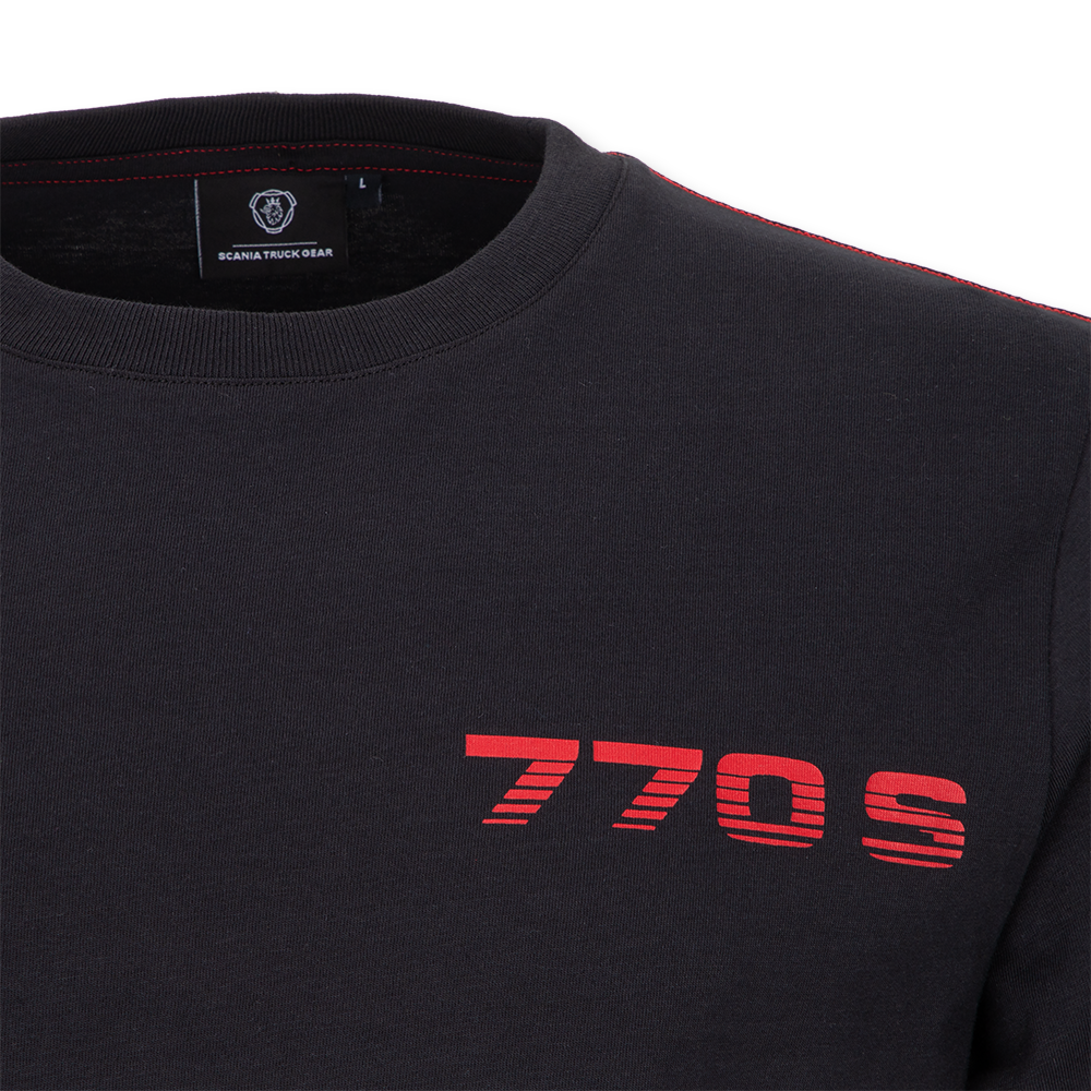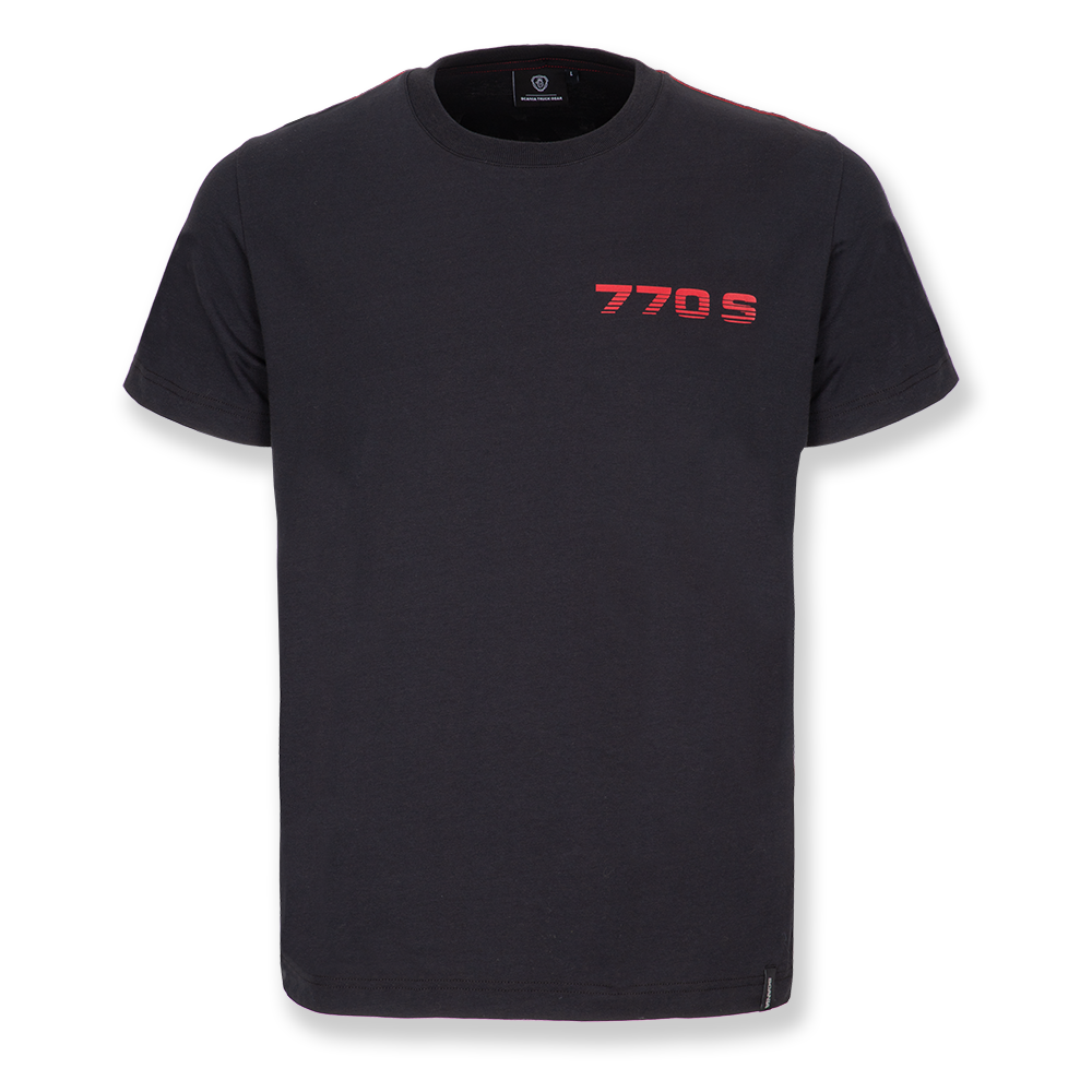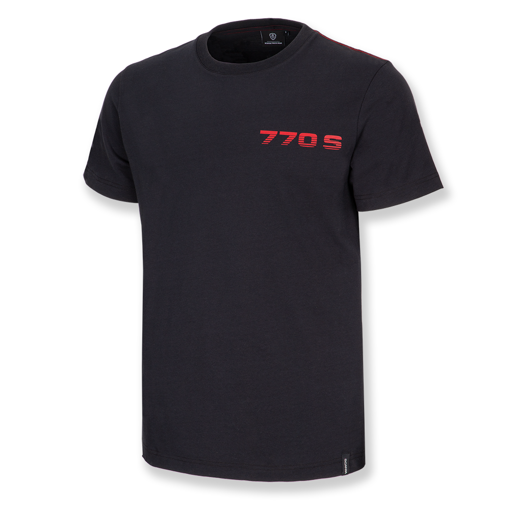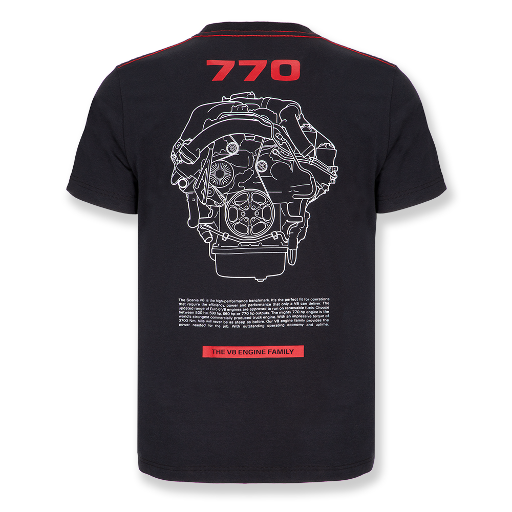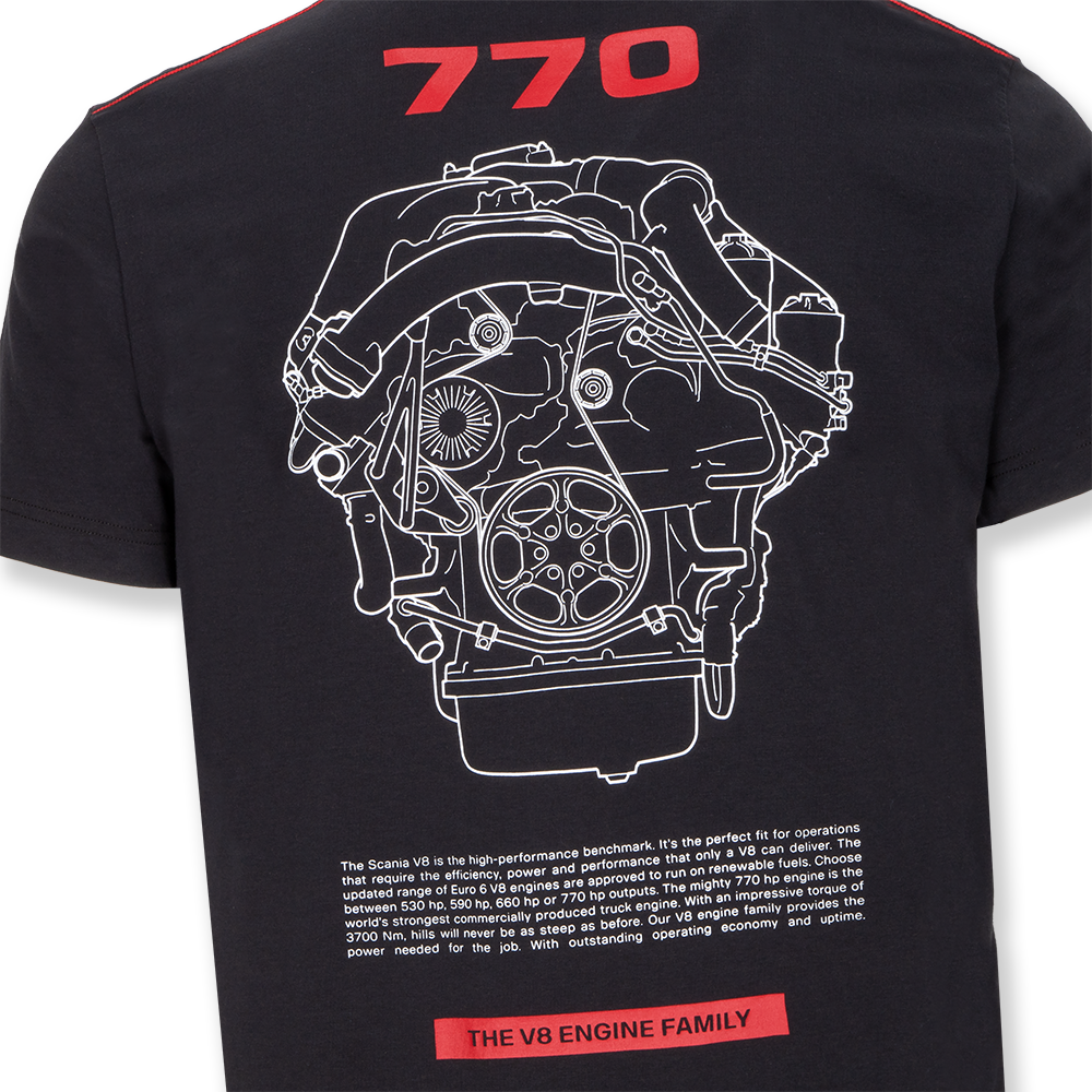 Details: Organic cotton black t-shirt, with 770 print engine to the back and engine details. 770 logo to the right chest and Scania wordmark woven tab to the bottom right hem.