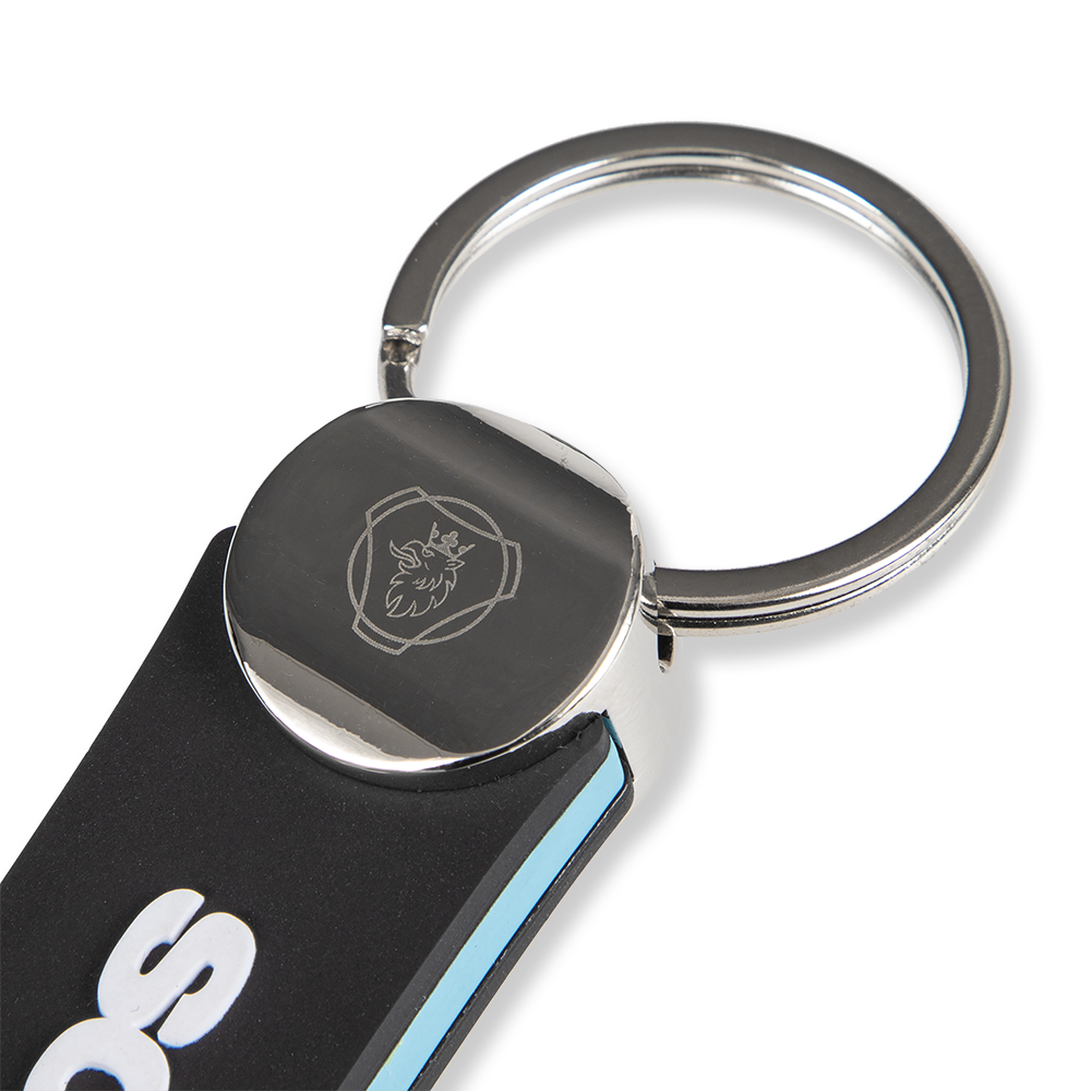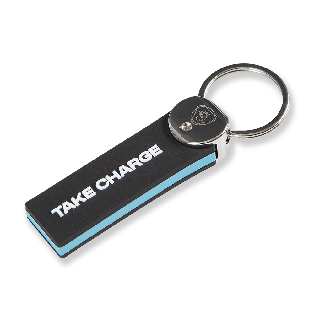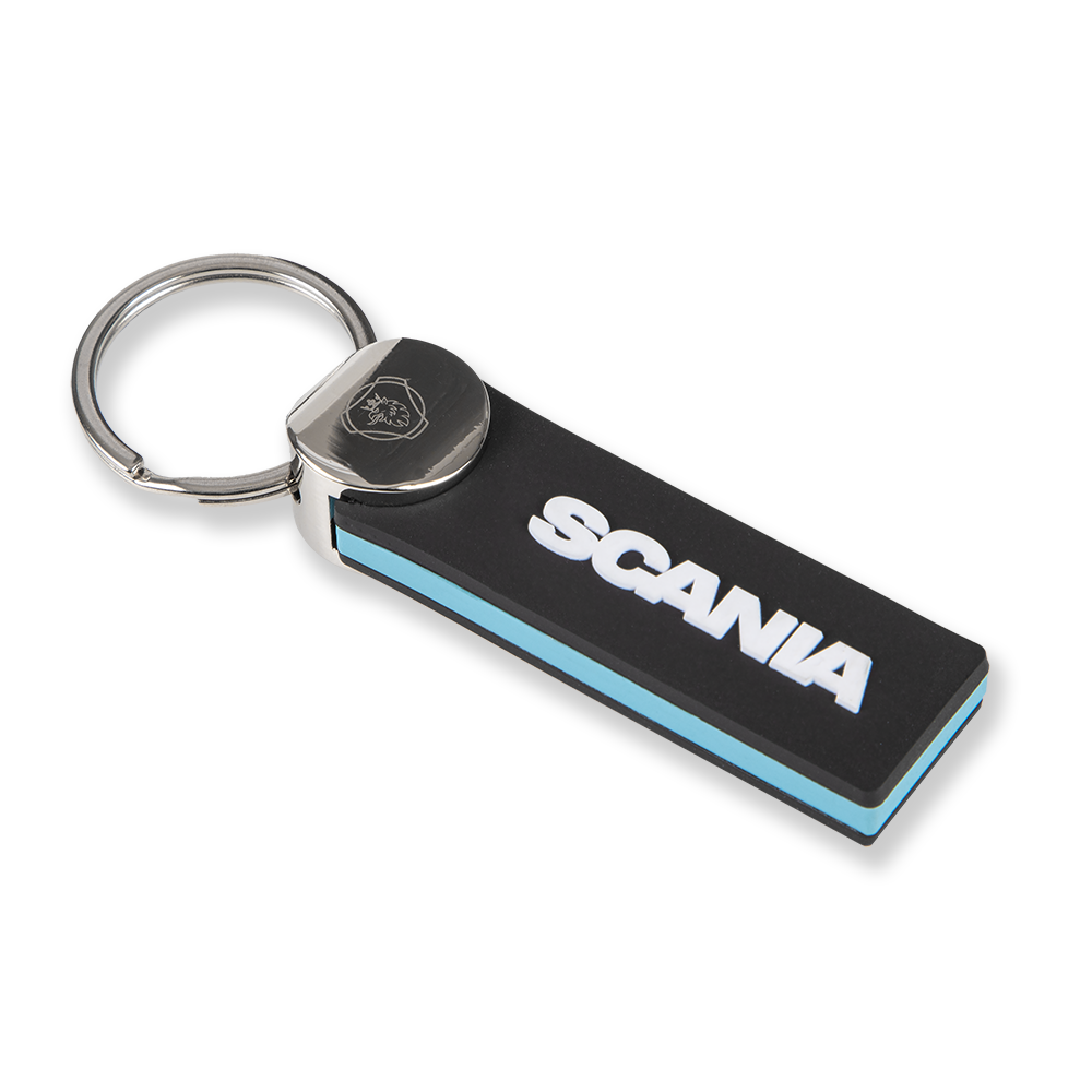 Details: Keyring with Scania symbol engraved into the metal. Raised Scania wordmark on one side and TAKE CHARGE on the other.