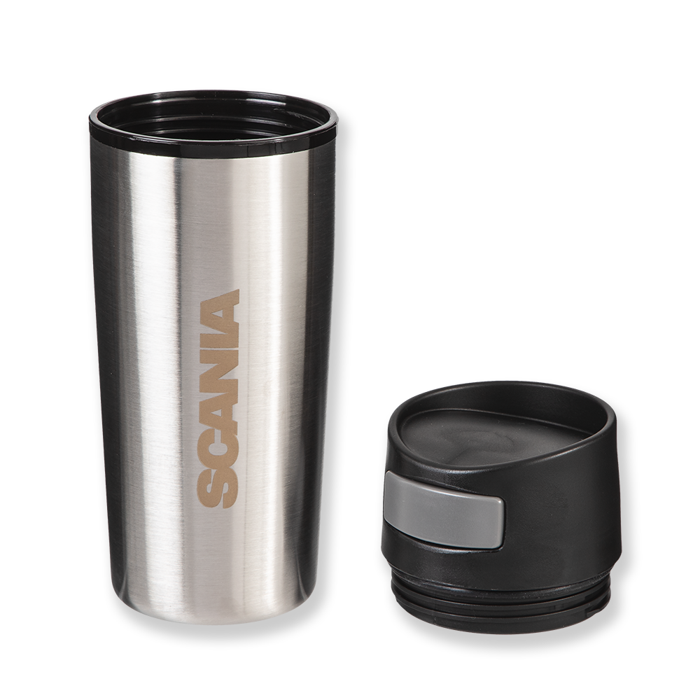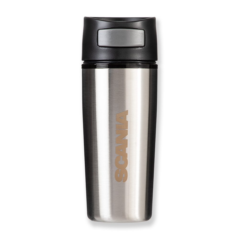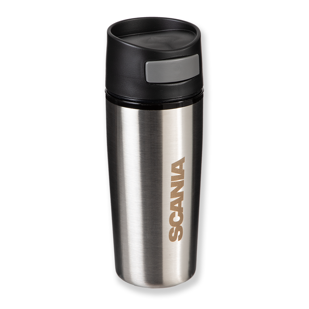 Details: Auto is a long lasting, re-usable leak proof thermo mug with an innovative push system which allows you to control it with only one hand. Engraved with Scania wordmark to the front. Keeps drinks hot for 3 hours and cold for up to 6 hours.