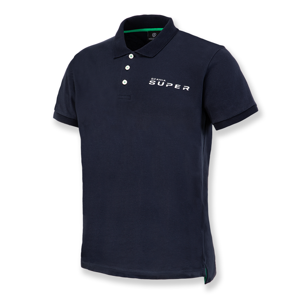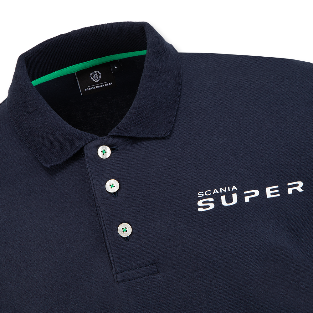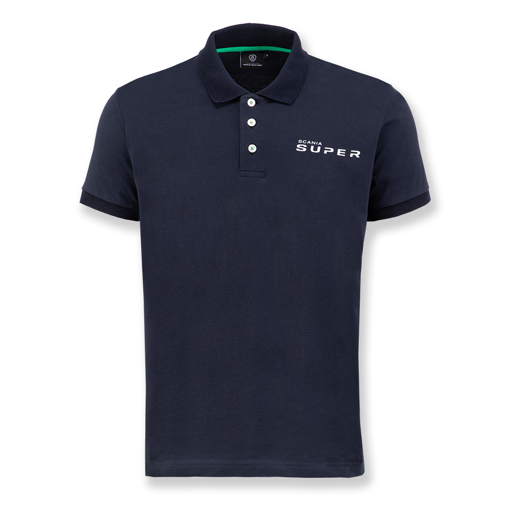 Navy polo with three buttons. With the Scania SUPER wordmark embroidered to the left chest in white.