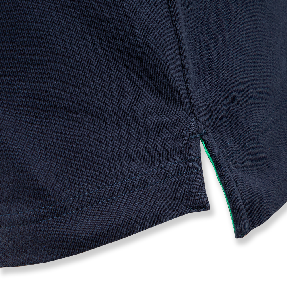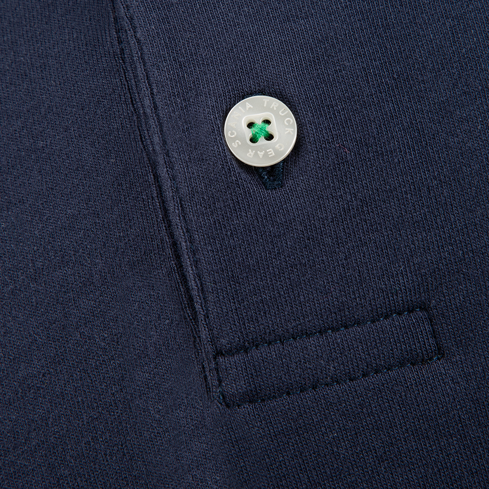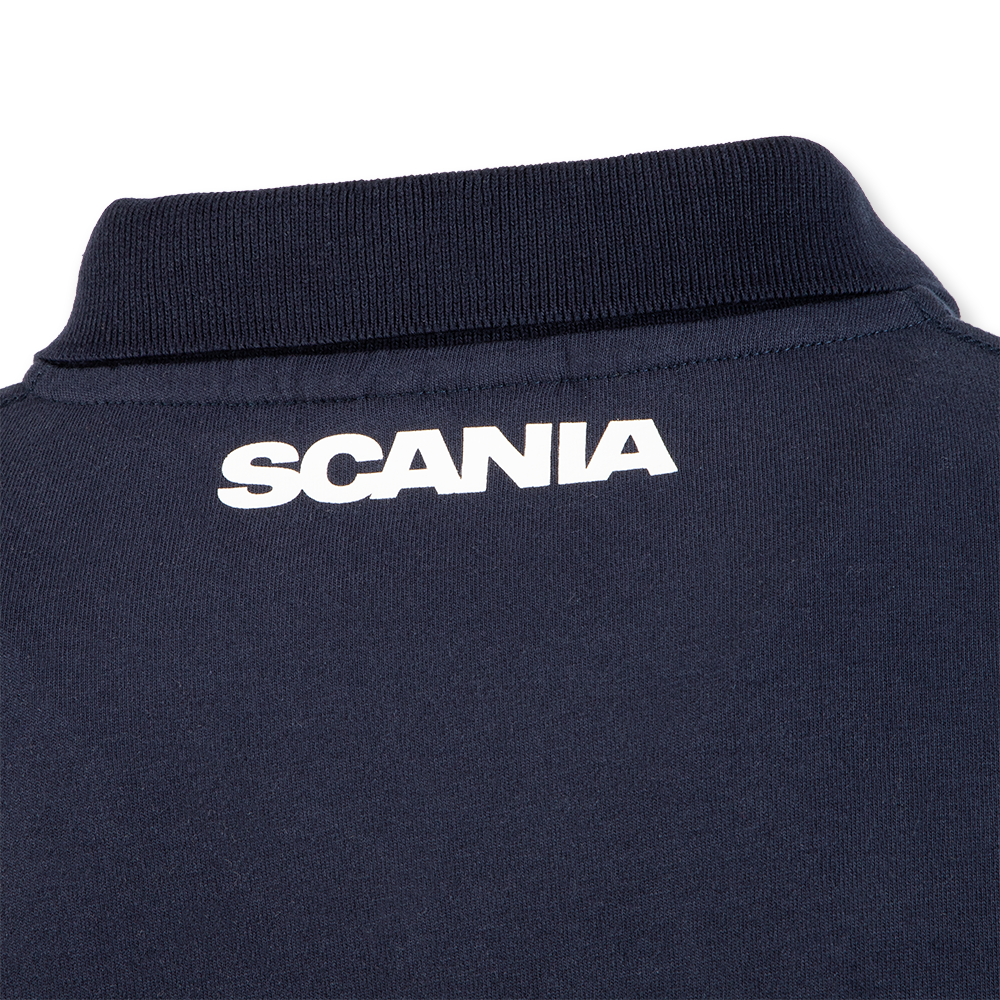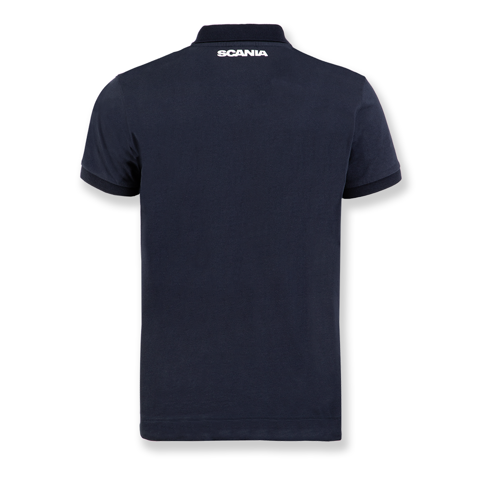 Navy polo with three buttons. With the Scania SUPER wordmark embroidered to the left chest in white.