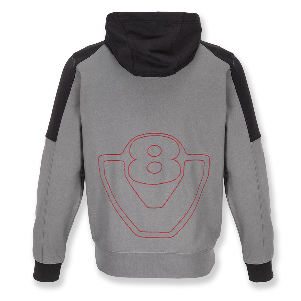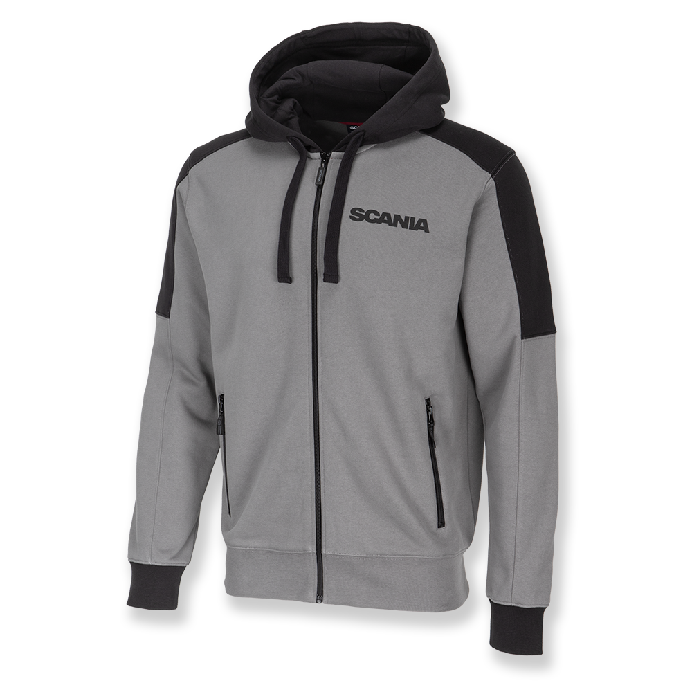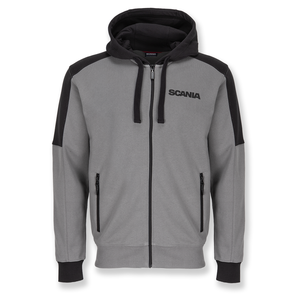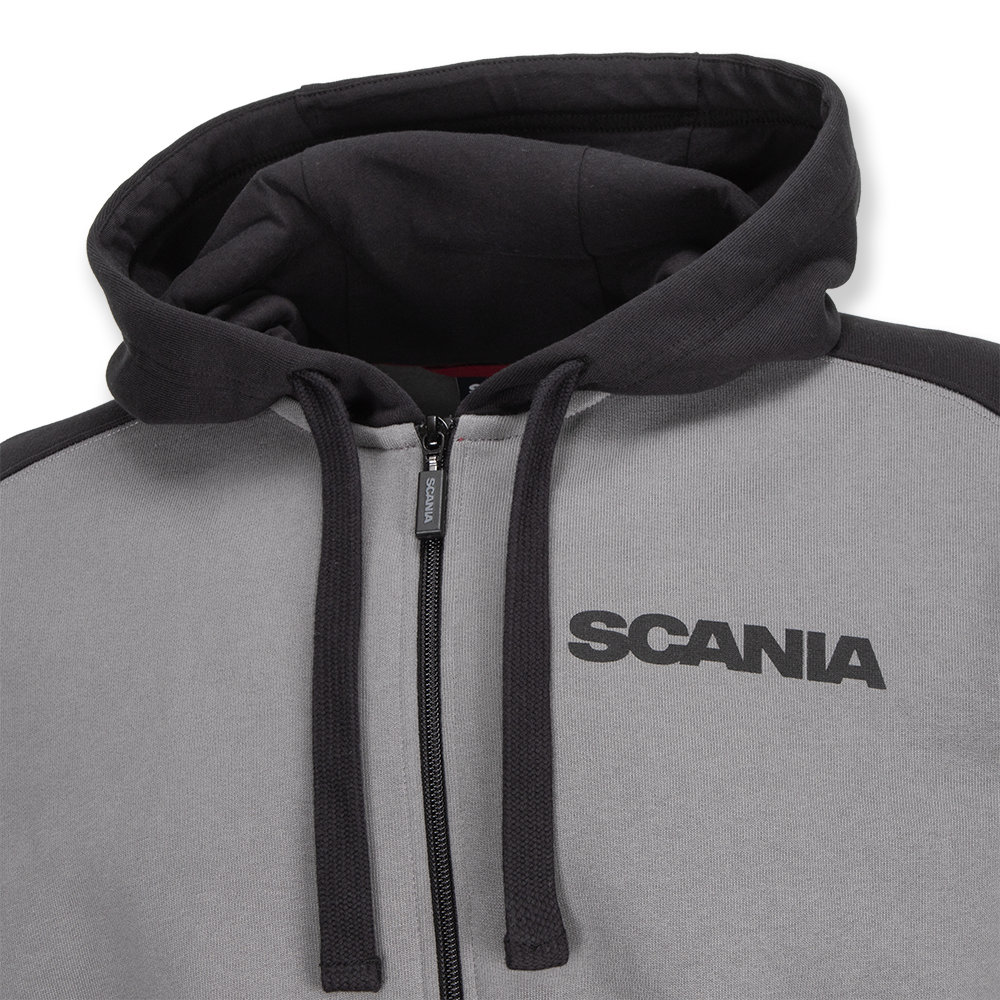 Details: Regular fit hoodie with contrasting colour panels on the hood, sleeves and cuffs. Featuring a large V8 embroidery at the back and Scania Wordmark print on the chest. Also features front zipper with rubber logo puller, pocket zippers and logotype pullers.