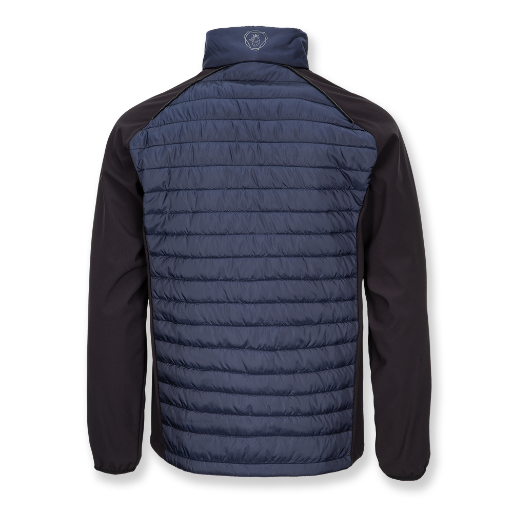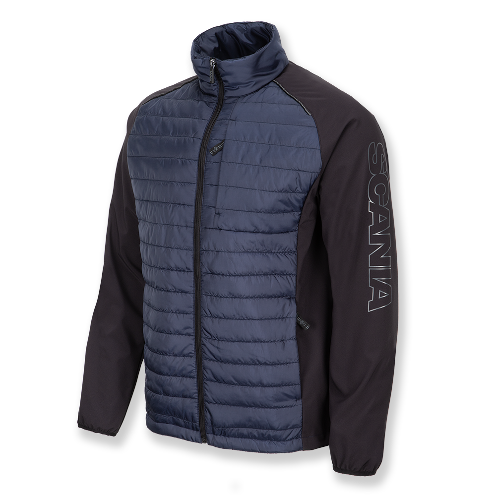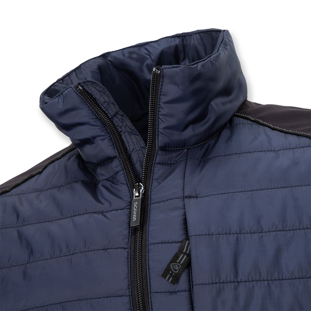 Details: A two-tone zip-up jacket with a quilted body and contrasting softshell fabric sleeves. Two zip side pockets and one zip breast pocked and large patch pocket to the inside. Reflective piping and Scania Wordmark and Symbol print.