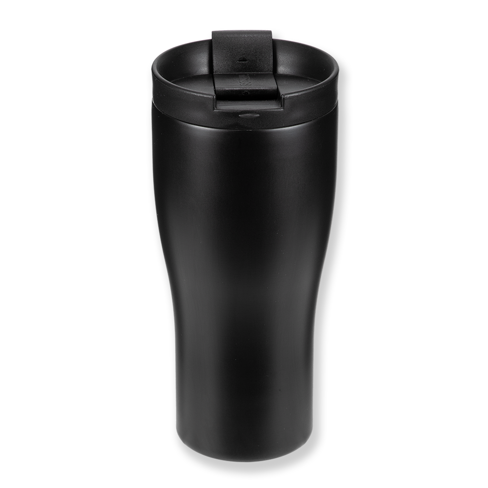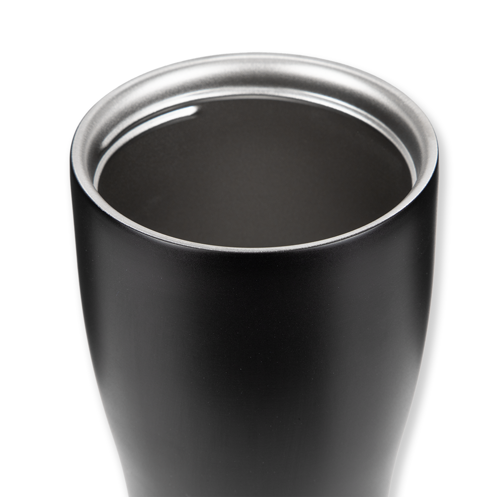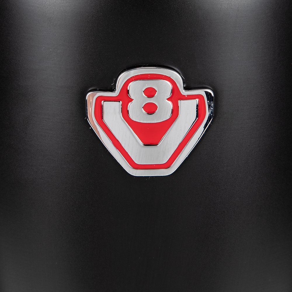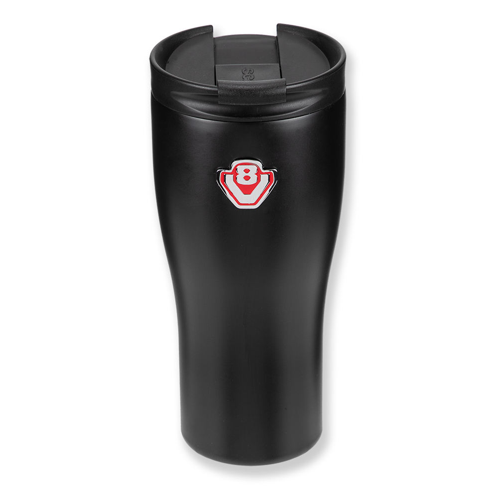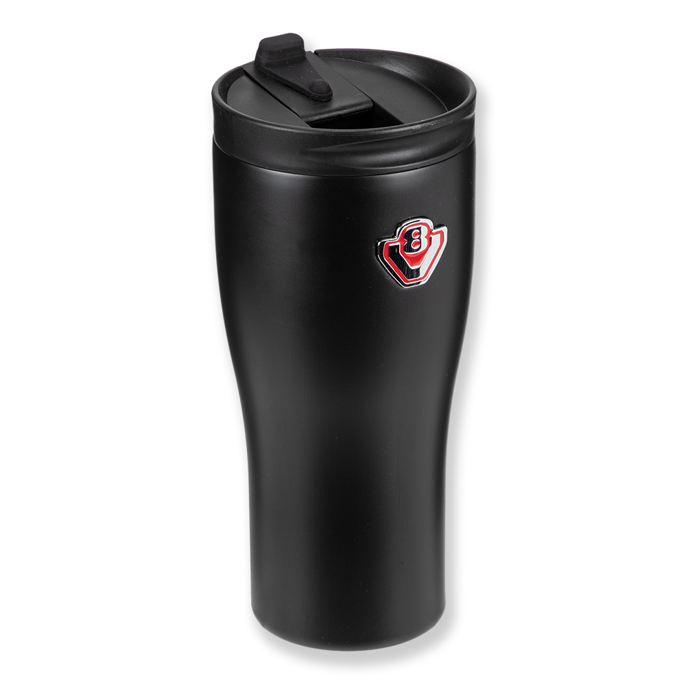A mug featuring a metal V8 symbol offers a unique finish for beverages on the move.